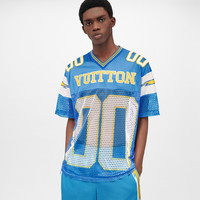 This oversized piece is all about the season's sportswear-influenced vibe, with a mix of fabrics and motifs. The top's shiny technical fabric contrasts with lightweight mesh on the body, and a compact cotton yoke on the sleeves. Louis Vuitton patches on the front and back are complemented by 3D screen-prints on the shoulders, and a sublimation print on the mesh. Detailed Features - Cotton, Polyester, Polyamide - Blue - Model wears a FR M size - Model measurements : chest 32’’ / 82 cm, height 6'3’’ / 189 cm