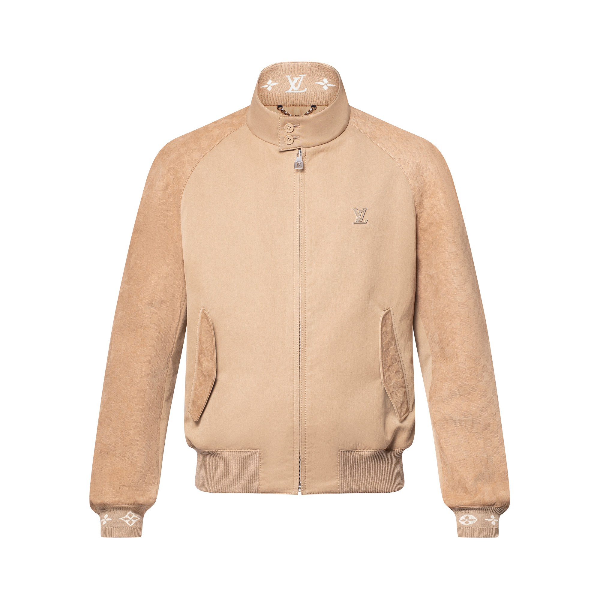 This preppy blouson twists a classic silhouette with Damier-embossed suede elements on the back yoke, sleeves and pockets, and a smooth cotton gabardine body. A tonal intarsia Monogram motif adorns the ribbed cuffs and the inside of the collar, while a metal LV ornament adorns the chest. The warm beige tones make this an elegant and versatile buy-now-wear-now piece for all seasons. - Regular fit - Beige - 50% Cow Leather, 38% Cotton, 12% Polyamide - Signature intarsia ribbing inside collar and on cuffs - Plain ribbed waist - Fully lined - Zipper fastening - Side pockets with snap buttons - Metal signature ornament on chest - Made in Italy