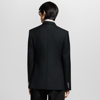 This sharply tailored double-breasted jacket from the Fall-Winter 2025 collaboration between Pharrell and Nigo is inspired by the latter’s Japanese roots. Crafted from black wool-mohair suiting, it is cut with a kimono-style collar and adorned with a pink origami Sakura flower button engraved with Monogram signatures, while a beaded Marque L.Vuitton Deposee patch signs the back. Matching flared or workwear pants in the same fabric make a contemporary suit. - Regular fit - Black - 60% Wool, 40% Mohair - Kimono collar - Fully lined - Origami signature button fastening - 3 piped pockets on the front - Pink quartz-like buttons on the cuffs - Bead-embroidered signature patch on back - Made in Italy