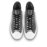 The Tattoo sneaker boot is reinterpreted this season in metallic Damier leather, which is a key theme of the Fall-Winter 2021 men's collection. The design of this classic hi-top is complemented by a white rubber toe cap and outsole. The Louis Vuitton signature is printed in black on the tongue. Detailed Features - Anthracite Gray - Metallic Damier leather - Rubber outsole - Louis Vuitton signature on the tongue - Made in Italy