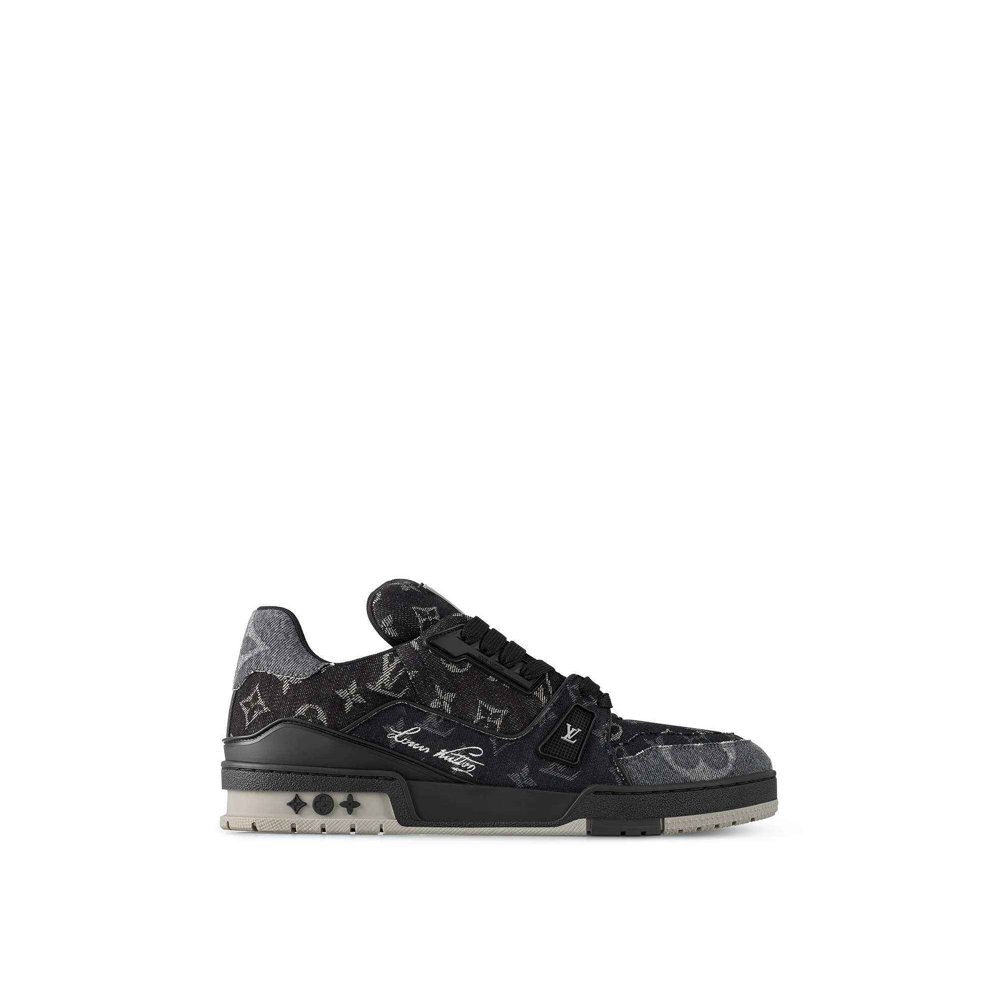 This version of the LV Trainer sneaker comes in a patchwork of Monogram denim with a refined play on color and scale. This iconic style, which was originally designed by Virgil Abloh, references vintage basketball sneakers. Its elaborately constructed upper, which takes Louis Vuitton artisans seven hours to stitch, is complemented by a bicolor rubber outsole. - Black - Monogram denim - 7 hours of stitching for one pair - Rubber outsole - LV Initials on the tongue and side - Louis Vuitton script signature on the side - Monogram Flower on the back - Monogram Flowers on the outsole - Made in Italy