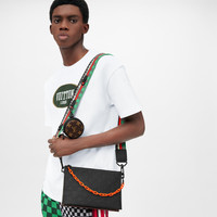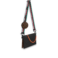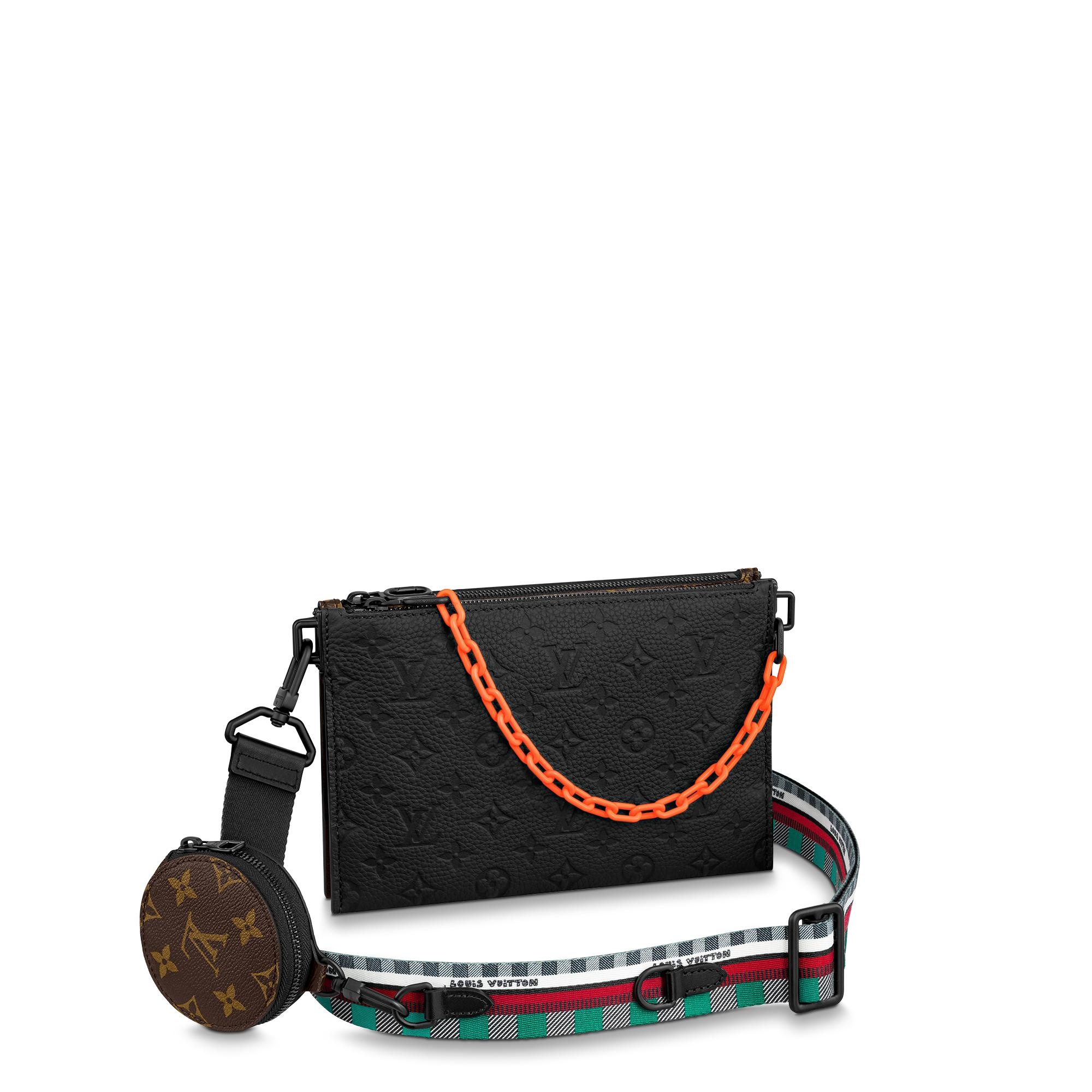 The modular Trio Pouch bag reflects the upbeat rave party spirit of Virgil Abloh’s “Amen Break” show for Spring-Summer 2022. This version mixes classic Monogram canvas with elegant black Taurillon Monogram leather, accented with a bright orange chain. Two main compartments plus a detachable round pouch and a Jacquard strap make it an eye-catching, practical day-to-evening companion. Detailed Features - Monogram coated canvas and black Taurillon Monogram leather - Cowhide leather trim - Textile lining - Black hardware - Signature chain - Two main zipped compartments - Removable round zipped pouch to hang on the strap - 3 D-rings - Strap:Removable, adjustable - Strap drop: 19.3 inches - Strap drop max: 29.1 inches - This reference is either Made in France, Spain, Italy or in the US. Length: 9.8 inches Height: 6.7 inches Width: 0.6 inches