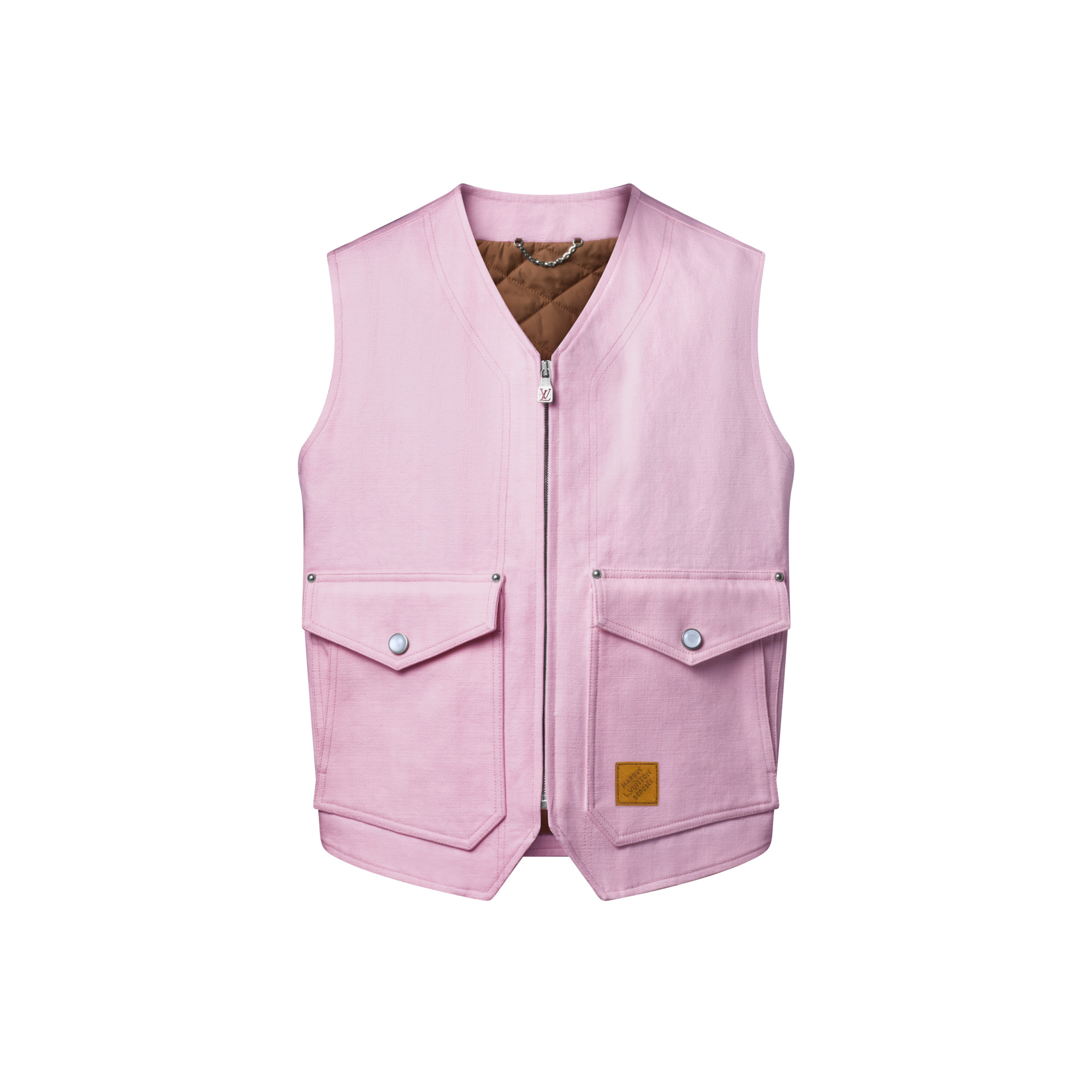 This cotton canvas zippered workwear gilet in cherry blossom pink tones nods to the American and Japanese roots behind the Fall-Winter 2025 show’s collaboration between Pharrell and Nigo. A leather Marque L.Vuitton Deposee label adorns one of the handy front pockets, which are embellished with pearly snap buttons. A lightly quilted interior makes this a perfect layering piece. - Regular fit - Pink - 100% Cotton - Quilted lining - Zippered fastening - 2 flap pockets with side openings and pearl-effect snap buttons - Leather signature patch - Made in Italy