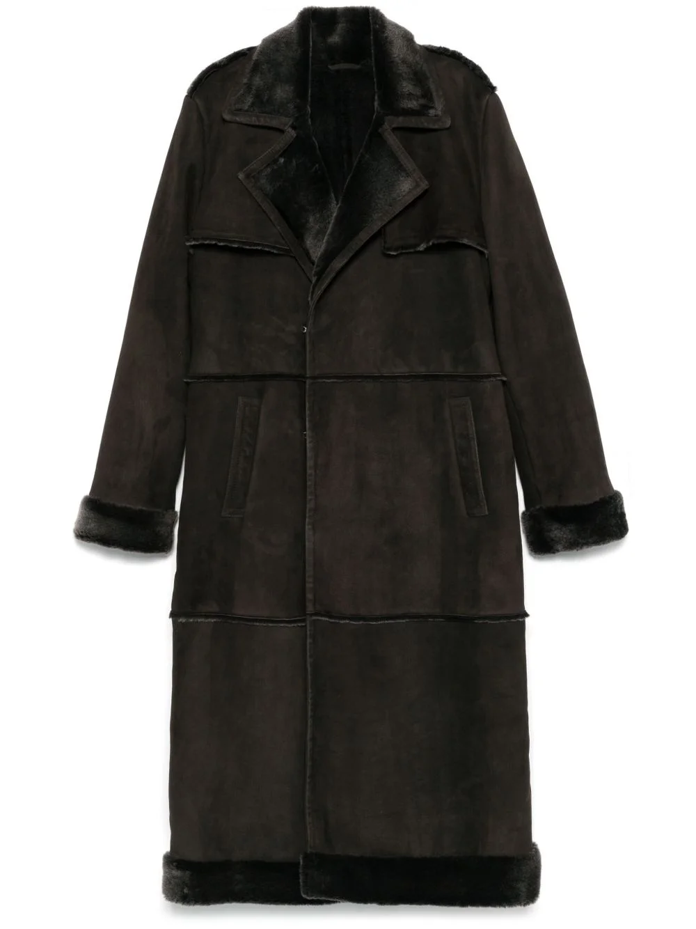 Deborah coat Highlights - Cedar brown - Hook fastening - Two side welt pockets - Central rear vent - Shearling lining - When buying this unisex item, keep in mind that it is graded in standard men's sizing. Imported Composition Body: Lambskin 100% Lining: Sheep Skin/Shearling 100% SIZE & FIT Model measurements Height 5 ft 9 in(1.75 m) Bust/Chest 34.64 in(88 cm) Hips 36.61 in(93 cm) Waist 26.37 in(67 cm) FittingInformation This unisex piece is designed for a loose fit whether you usually select women's or men's sizes The belt offers adjustability for fitted preferences Firm shearling has a treated construction offering some durability