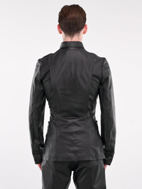 LUDOVIC DE SAINT SERNIN jacket in black, lamb leather construction, spread collar, front concealed button placket closure, long sleeves, chest welt pocket, side patch pockets, eyelets & lace-up fastening, straight hem, slim fit. Made in Turkey 100% Lamb Leather Standard Sizing Model is 6’0” wearing size M. Shoulders: 19" Chest: 38” Waist: 30”