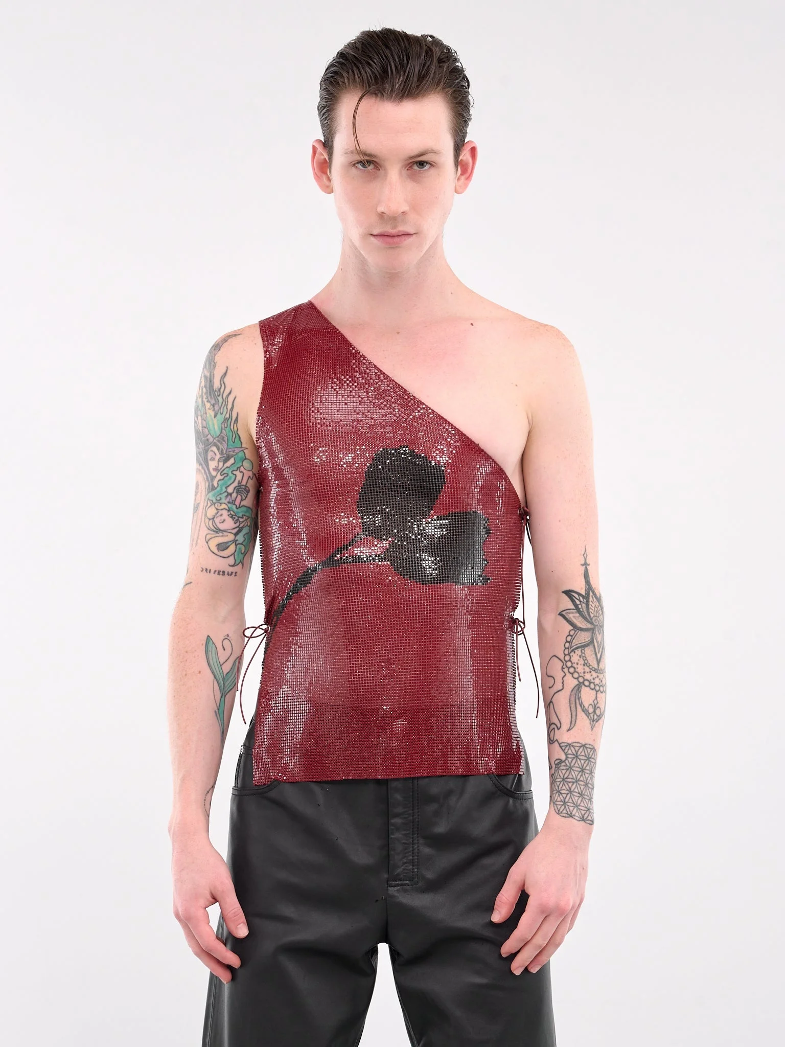 LUDOVIC DE SAINT SERNIN tank in red, paneled metal mesh construction, graphic pattern, one shoulder strap, sleeveless, armscyes, side self-tie fastenings, straight hem, slim fit. Made in France 100% Metal Mesh Standard Sizing Model is 6’0” wearing size XS. Shoulders: 19" Chest: 38” Waist: 30”