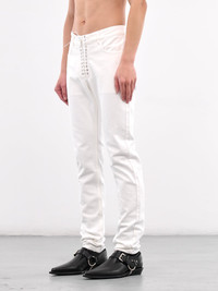 LUDOVIC DE SAINT SERNIN jeans in white, paneled denim construction, belt loops, front metal eyelets & lace-up fastening, back logo patch, inset pockets, coin pocket, back patch pockets & metal eyelets, straight leg, slim fit. Made in Morocco 100% Cotton Standard Sizing Model is 6'1" wearing size 30. Shoulders: 18" Chest: 36" Waist: 30"