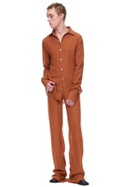 LUDOVIC DE SAINT SERNIN shirt in terracota, semi-sheer, stretch-fabric, pointed collar, button closure, elongated length, curved hem, slim fit, gender-neutral. Made in France Standard Sizing 100% Polyester Model is 5'11" wearing size S. Shoulders: 18" Chest: 34" Waist: 29"