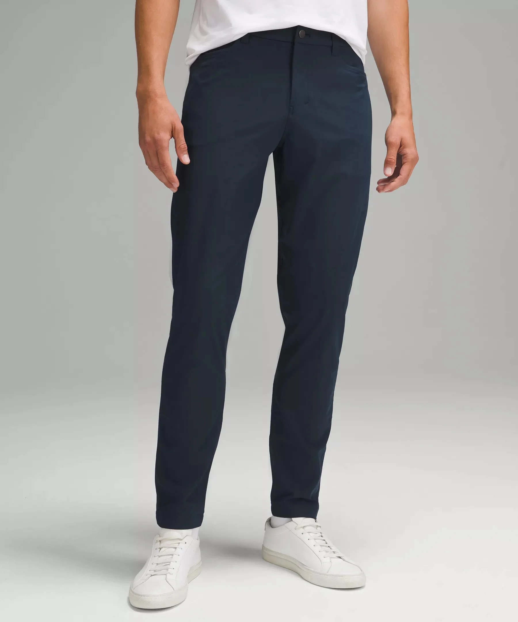Everyday Performance, Warpstreme™ Fabric Everyday performance Shape retention Quick-drying Four-way stretch Breathable Wrinkle-resistant Feels smooth, falls softly away from body This product contains recycled polyester made from repurposed plastic waste Slim Fit, 34" Length Slim fit that skims glutes and thighs Our ABC™ (Anti-Ball-Crushing) technology uses an ergonomic gusset to remove tension from the crotch of our pants so you can move in comfort Product Features Hand pockets, a phone pocket, and an internal sleeve to stash coins Back pocket with hidden zippered compartment Flip up the cuffs to reveal reflective details Material and care Materials Pocket Lining: 100% Recycled Polyester Body: 53% Elastomultiester47% Recycled Polyester Care Machine Wash Cold Do Not Bleach Tumble Dry Low Do Not Iron Do Not Dry Clean Wash With Like Colors
