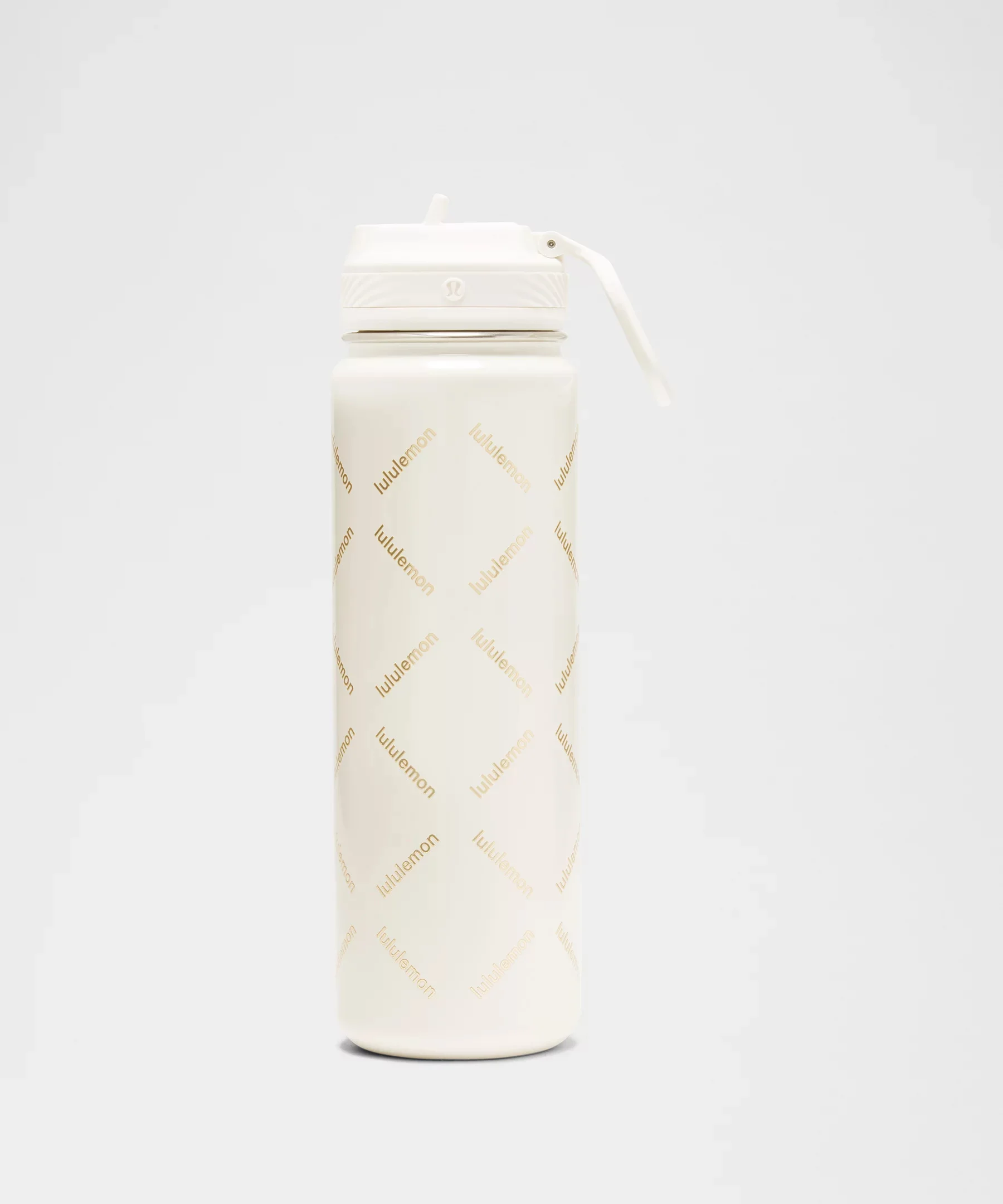 Designed for Casual Dimensions and Volume - Dimensions: 26.4cm x 7.7cm (10.4" x 3") - Volume: 24oz (710ml) Product Features - Folding straw lid for easy sipping - Double-wall design keeps bottle sweat-free - Vacuum insulation keeps drink ice cold - No-flavour transfer keeps contents tasting fresh - Care Instructions: Wash before use. Lid is dishwasher-safe on top rack only. Please hand wash the body of the bottle to preserve the finish. Do not fill with hot water - To deep clean the lid, remove the interior silicone ring and soak in a 2:1 solution of water and vinegar, or cleanse using dish soap. Do not use harsh chemicals like bleach or chlorine - To reassemble, press the ring back into the lid’s open cavity with the tab exposed. Ensure the ring is evenly pressed into the cavity before screwing the lid back on for a secure, leak-proof fit - Due to the nature of the finish, please use care when storing your bottle in bags or backpacks, and around sharp objects such as keys. Hand-wash only as finish may chip or peel in the dishwasher. Natural wear may occur over time Material and care Materials Body: 100% Steel - Band: 100% Silicone - Top: 100% Polypropylene Care Body - Hand Wash Only - Do Not Use with Hot Water - Lid - Dishwasher Top Rack - Wash Before Use