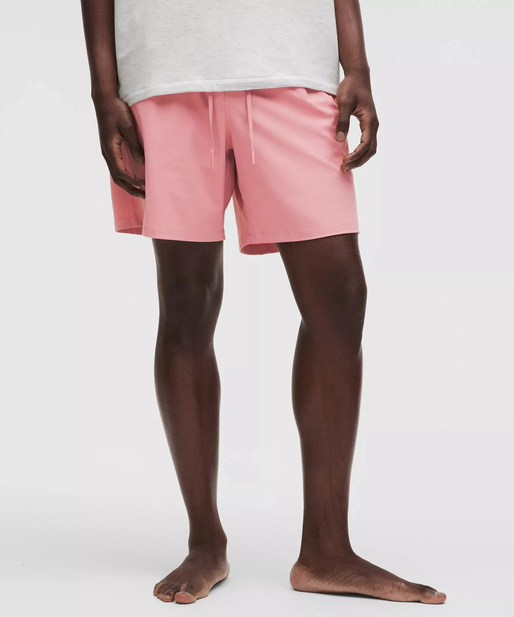 Designed for Yoga Lightweight, Woven Fabric - Lightweight - Soft - Sweat-wicking - Four-way stretch - 100% of the polyester and nylon in this product is recycled (excluding trims) Relaxed Fit, 7" Length - Roomy fit through glutes and thighs Product Features - Hand pockets with hidden phone sleeves - Waistband drawcord can be worn inside or out Material and care Materials Pockets: 100% Recycled Polyester - Inner Waistband: 84% Recycled Polyester16% Elastane - Body: 85% Recycled Nylon15% Elastane Care Machine Wash Cold - Do Not Bleach - Tumble Dry Low - Do Not Iron - Do Not Dry Clean - Wash With Like Colors
