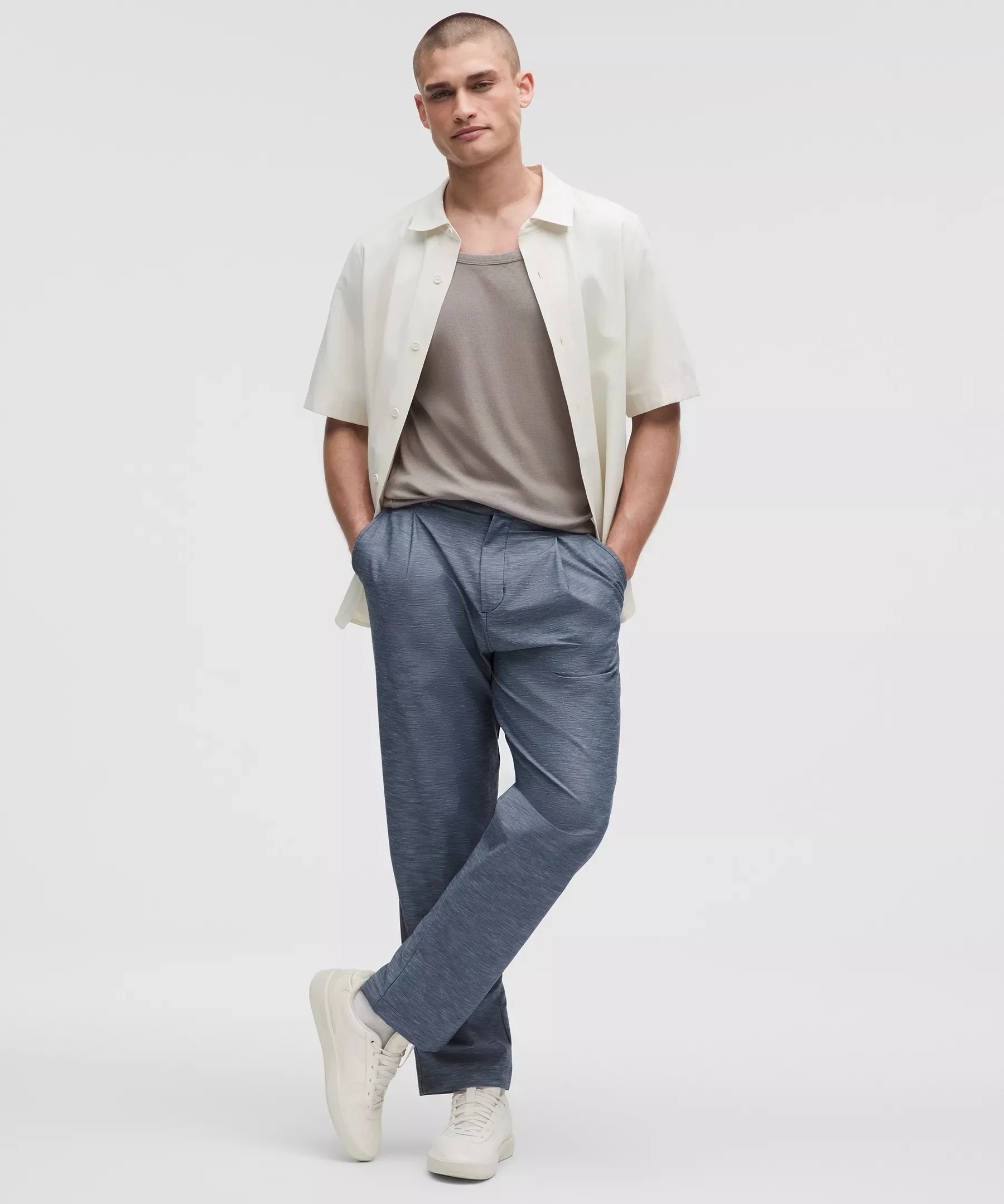 Designed for Casual LuluLinen™ Fabric - Cotton blend with a touch of linen fibres - Sweat-wicking - Quick-drying - 100% of the polyester and nylon in this product is recycled (excluding trims) Classic Fit - Streamlined fit that gives glutes and thighs breathing room - Intended to sit just below ankle for 32"-34" inseam Product Features - Hand pockets with hidden phone and coin sleeves - Back welt pockets with hidden snaps Material and care Materials Body: 67% Recycled Polyester23% Cotton10% Linen - Pocket Lining: 100% Recycled Polyester Care Machine Wash Cold - Do Not Bleach - Tumble Dry Low - Do Not Iron - Do Not Dry Clean - Contains biocidal zinc pyrithione (nano) Inhibits odour-causing bacteria - Wash With Like Colors