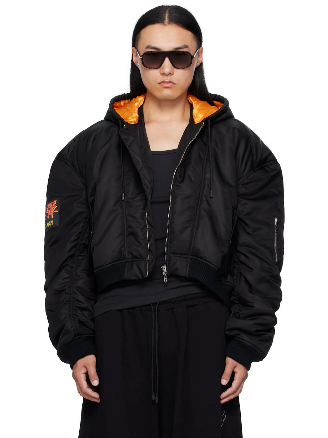Structured nylon twill bomber jacket. · Drawstring and logo patch at hood · Zip closure · Flap pockets at front · Rib-knit hem and cuffs · Logo patch, utility pocket, and pen slots at sleeves · Full satin twill lining Supplier color: Black Body: 100% nylon. Lining: 100% acrylic. Made in Portugal 252331M175001