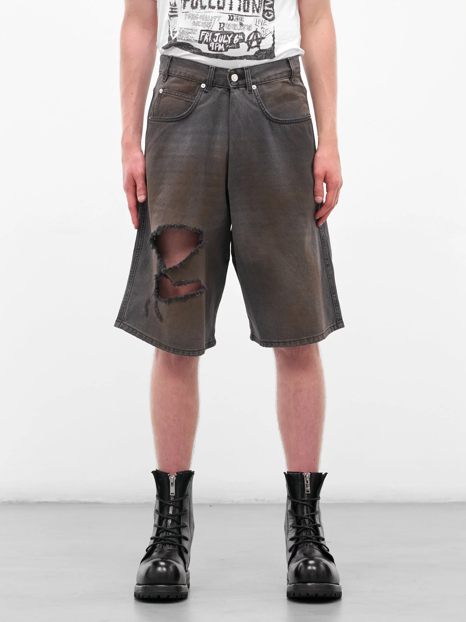Brown denim shorts with a faded and dirtied effect, distressed finishes, and five-pocket styling. Belt loops and a back logo patch complete the relaxed knee-length silhouette. Featuring: • Relaxed fit • Denim construction • Faded and dirtied effect • Distressing throughout • Belt loops and back logo patch • Front button and zip fly closure • Five-pocket styling • Knee-length • Straight leg • Made in Italy • 100% Cotton • Standard sizing Model is 6'3" wearing size 32. Shoulders: 18" Chest: 34.5" Waist: 29.5"