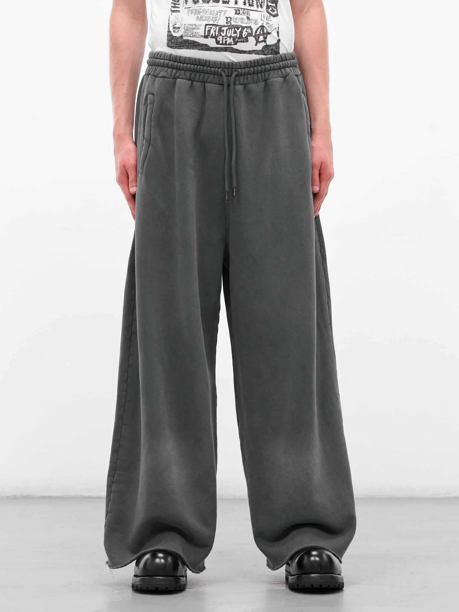 Dark smoke fleece sweatpants featuring raw hems and wide legs. A relaxed baggy silhouette is finished with an elasticated waistband and adjustable drawstring. Featuring: • Baggy fit and wide leg • Fleece construction • Elasticated waistband with drawstring • Three-pocket styling • Raw hems • Made in Portugal • 100% Cotton • Standard sizing Model is 6'3" wearing size M. Shoulders: 18" Chest: 34.5" Waist: 29.5"