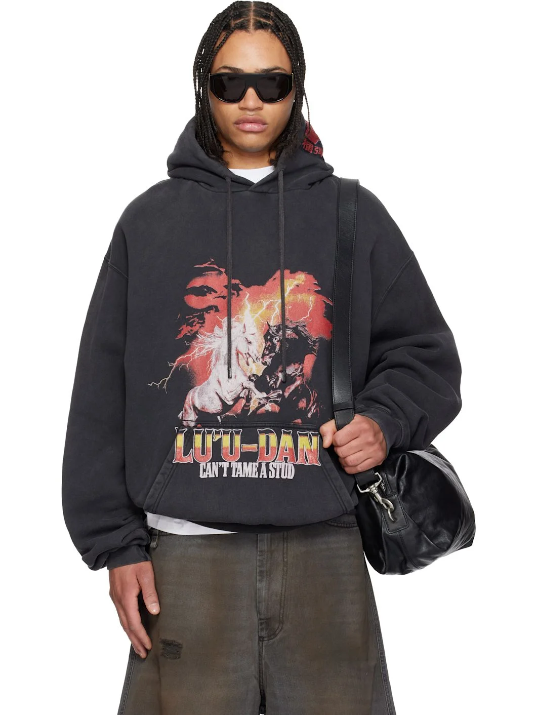 Cotton fleece hoodie. · Logo patch and drawstring at hood · Graphic, logo, and text printed at front · Kangaroo pocket at waist · Rib-knit hem and cuffs · Dropped shoulders · Text and logo printed at back Part of the LU'U DAN Year of the Horse capsule. Supplier color: Vintage black 100% cotton. Made in Portugal 261331M202002