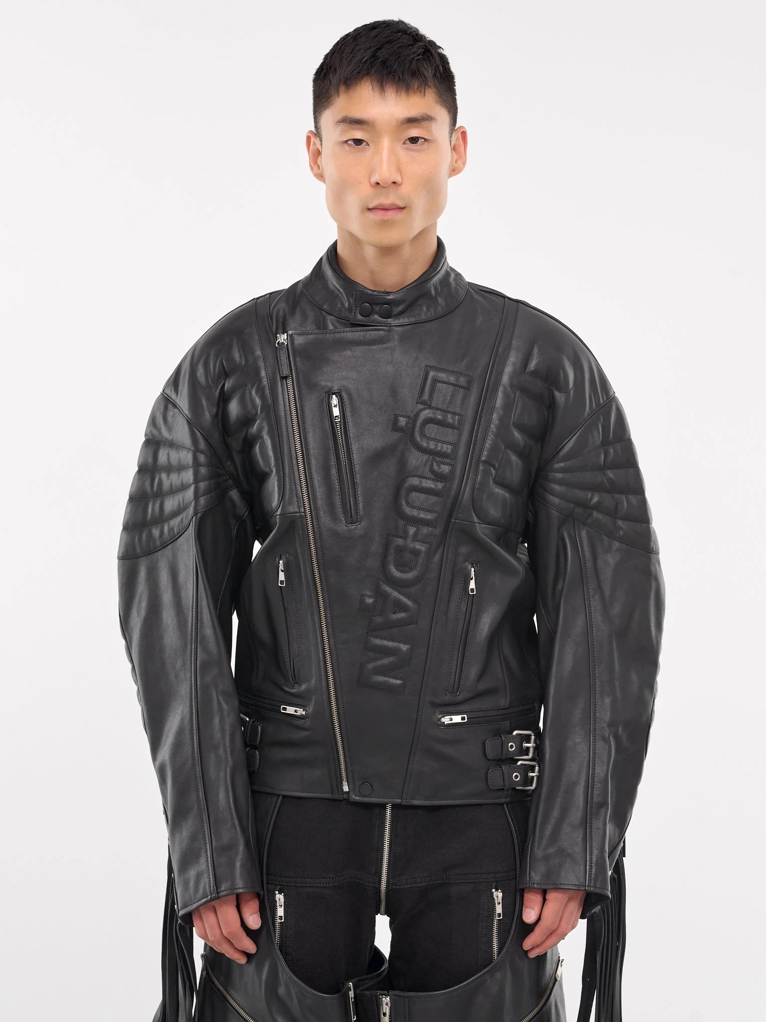 LU'U DAN jacket in black, paneled calf nappa leather construction, stand collar, double-breasted zip closure, debossed logo, long sleeves, biker detailing, back fringing, front zip pockets, straight hem, relaxed fit. Made in Turkey 100% Calf Nappa Standard Sizing Model is 6'1" wearing size M. Shoulders: 18" Chest: 36" Waist: 28"