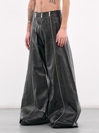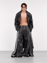 LU'U DAN trousers in black, paneled leather construction, embossed pattern, fitted waist, front wrap-around exposed zip closure, front & back full-leg zip vents, wide leg, baggy fit. Made in Turkey 100% Calf Leather Standard Sizing Model is 6'1” and wears a size 32. Shoulders: 17” Chest: 33” Waist: 30”