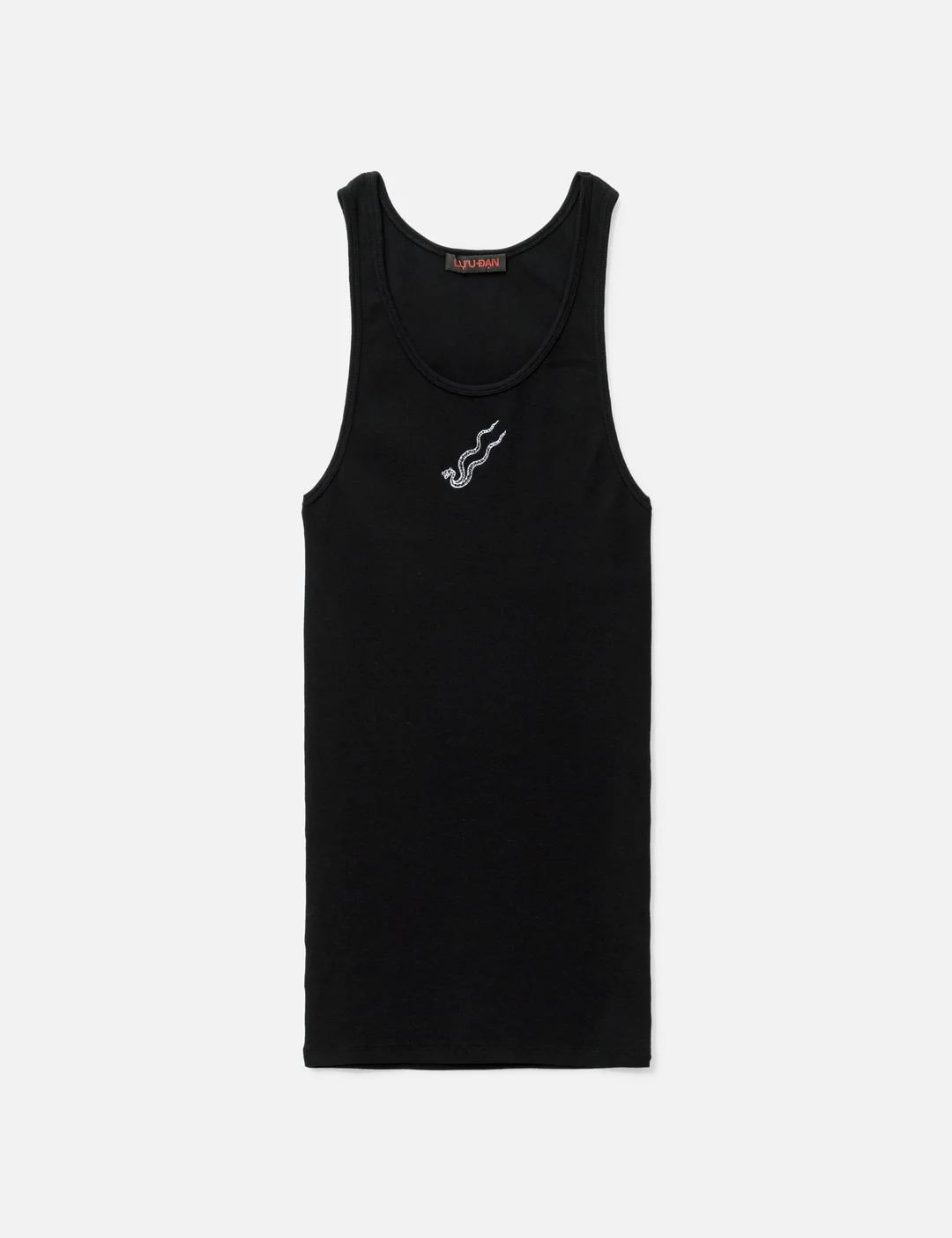 - LUU DAN - Logo Tank Top - Made of lightweight rib cotton jersey - Fitted - Logo embroidery at front - Ribbed collar and armhole - Color: Black - Material: 100% Cotton - See more Tanks and Clothing SIZING - Model wears size M - Model measures: Height 184cm, Chest 29"/73cm, Waist 24"/62cm, Hip 35"/90cm