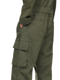 Lu'u Dan jumpsuit in khaki green, point collar, zip closure with leather pull tab, dual chest pockets, elastic waist, side & back pockets, leg patch pocket, relaxed fit. European Sizing Composition: 70% Cotton, 30% Cordura Model is 6’0” and is wearing a size 44. Shoulders: 18.5” Chest: 36” Waist: 30”