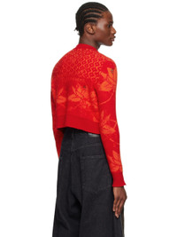 Knit virgin wool sweater. Distressing and jacquard logo graphic pattern throughout. · Rib knit crewneck, hem, and cuffs · Cropped hem Supplier color: Orange/Red 100% virgin wool. Made in Belgium 232331M201005
