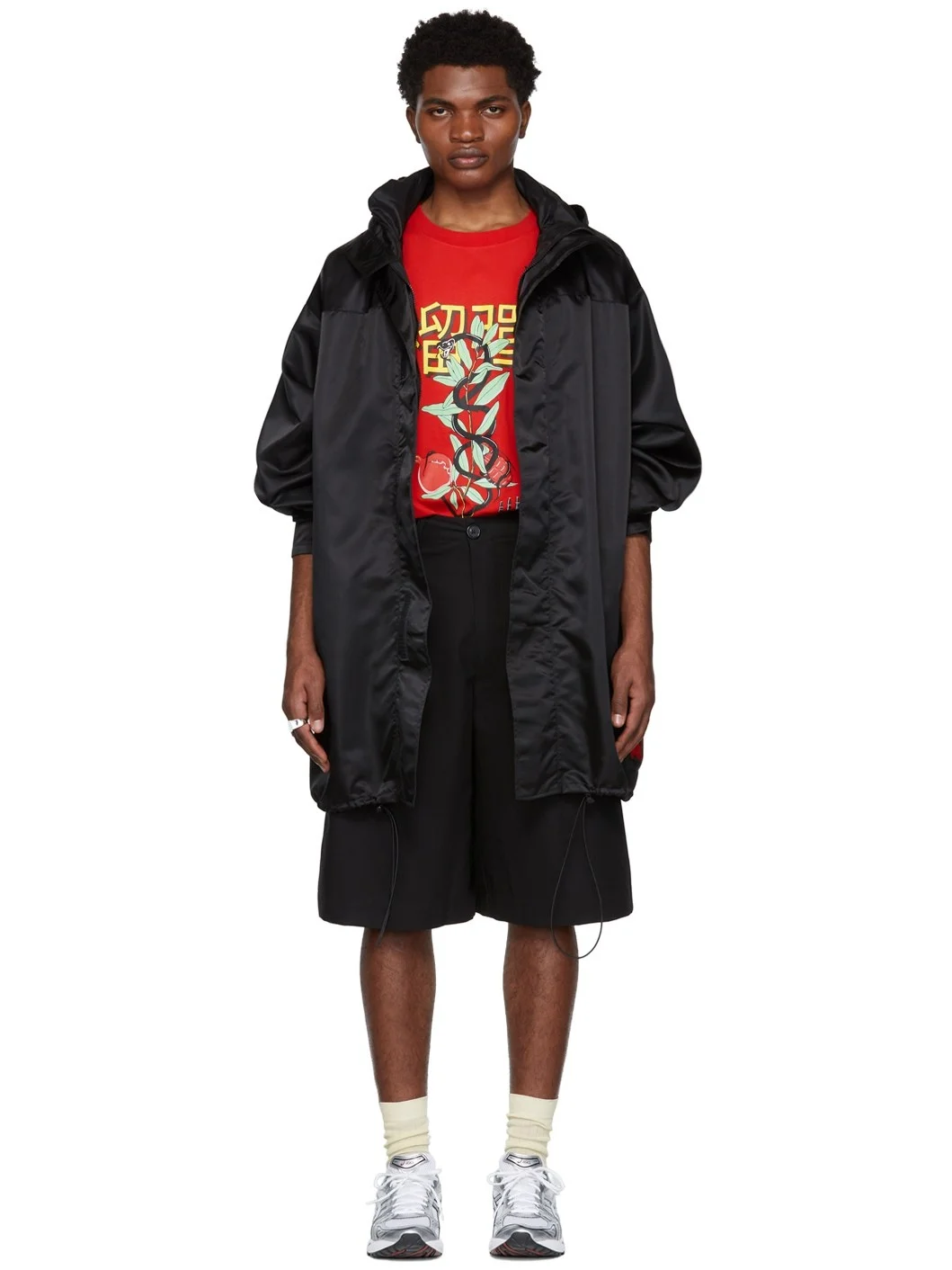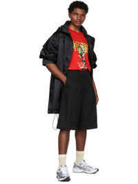 Long sleeve nylon twill coat in black. Textile logo patch in black and red at hem. · Stowaway hood at stand collar · Concealed zip closure and Velcro placket · Concealed zip pocket at chest · Seam pockets at waist · Bungee-style drawstring at hem · Unlined Available exclusively at SSENSE. Supplier color: Black 100% polyamide. Made in Portugal 221331M176003
