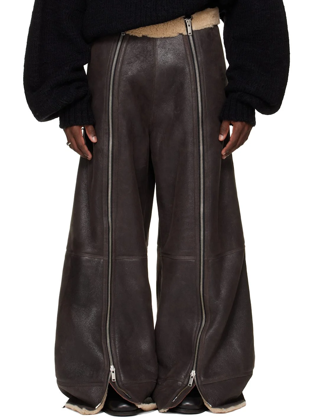 Grained sheepskin pants. · Shearling trim at waistband · Two-pocket styling · Exposed zip fly · Zip vents at front and back legs · Raw edge at cuffs · Shearling interior Available exclusively at SSENSE. Supplier color: Brown/Cream Body: 100% lambskin. Trim: 96% cotton, 4% elastane. Made in Turkey 261331M189001
