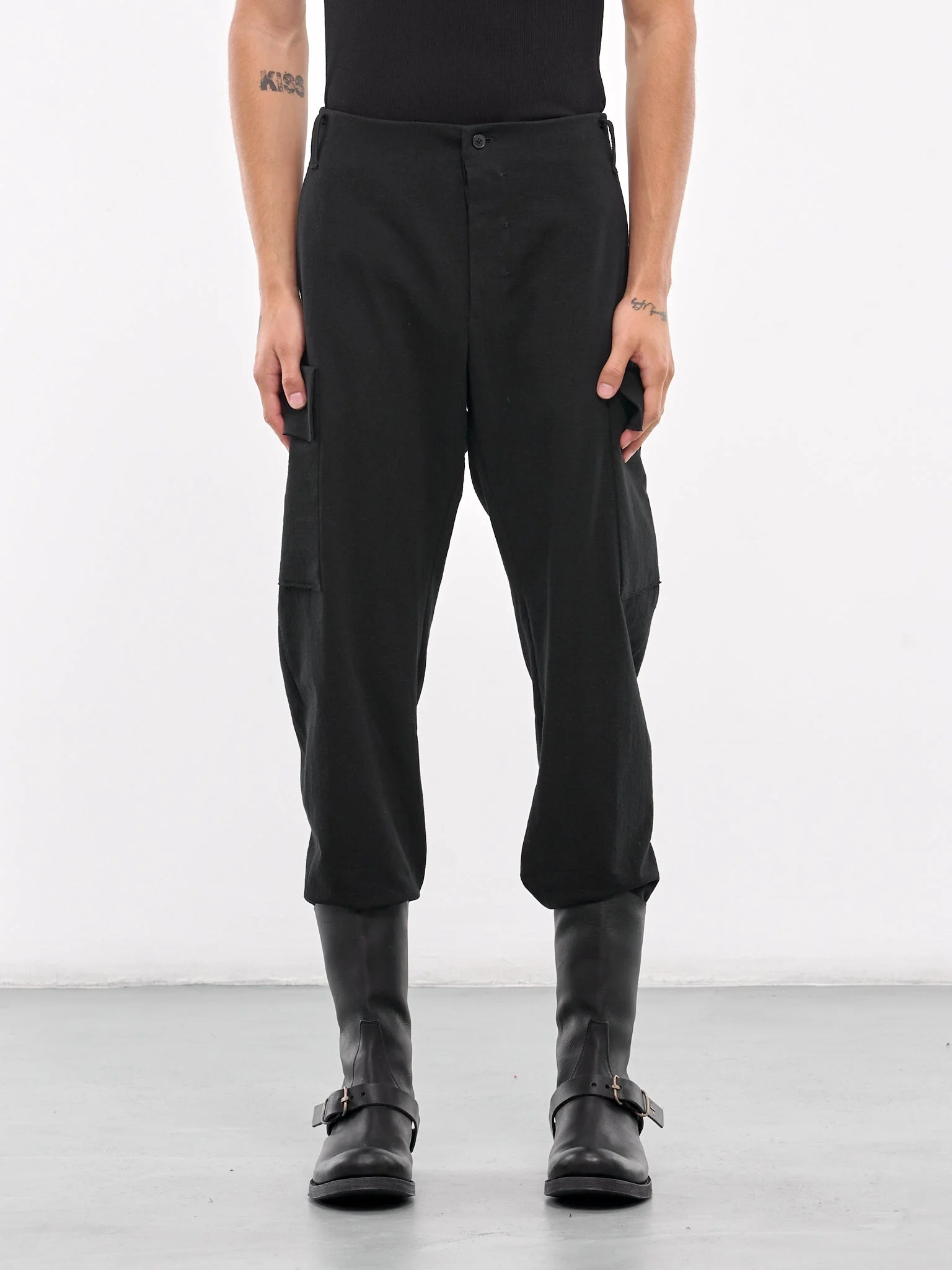 MA+ trousers in black, paneled cotton construction, belt loops, front button & concealed zip fly, side seam pockets & back welt pockets, side cargo pockets, tapered leg, loose fit. Made in Italy 100% Cotton European Sizing Model is 6'2" wearing size 48. Shoulders: 19" Chest: 38" Waist: 30"