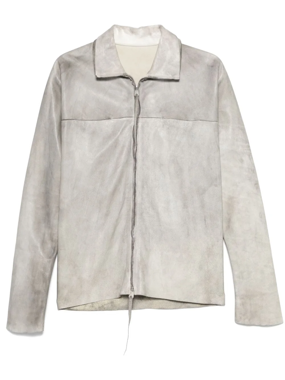 leather jacket Highlights - Grey - Front two-way zip fastening - Slit pockets at the chest - Suede lining - Spread collar Made in Italy Composition Calf Leather 100% SIZE & FIT Model measurements Height 6 ft 2 in(1.87 m) Bust/Chest 38.18 in(97 cm) Hips 36.61 in(93 cm) Waist 29.13 in(74 cm) FittingInformation Designed for a slim fit, offering a comfortable fit that sits just away from the body Soft leather has a supple and smooth construction offering some flexibility This piece fits small – take one size up