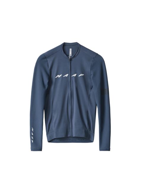 Our best-selling Evade Pro Base Long Sleeve Jersey 2.0 is made with sustainable materials and ultra-soft, moisture-wicking fabrics. Designed for a fit so comfortable, you'll forget you’re wearing it- even when the pace heats up. Details - Recycled Yarns - MAAP Honeycomb - Moisture Wicking - bluesign® APPROVED Fabric - Breathable - Reflective Graphics - Italian Fabric Features - The high-performance silhouette of our Race Fit features advanced sleeve fit, low-profile collar and tailored panelling for speed and precision. - Advanced breathability achieved through premium recycled honeycomb mesh sleeves. - More secure storage and an elevated fit with streamlined bonded front hem and rear pocket-edge construction. - Additional storage with a sleek and secure low-profile internal rear zip pocket. - Extra visibility in low light conditions with reflective print transfers and tabs. Specifications - Product Weight: 150 g - Main Fabric Content: MAIN BODY: 70% POLYAMIDE (RECYCLED), 30% ELASTANE, SLEEVES: 78% POLYAMIDE (RECYCLED), 22% ELASTANE - Fit: Race - Temperature Range: 18 - 35 DEGREES - Riding Conditions: Hot - SKU: MPMLS221125_MIDN