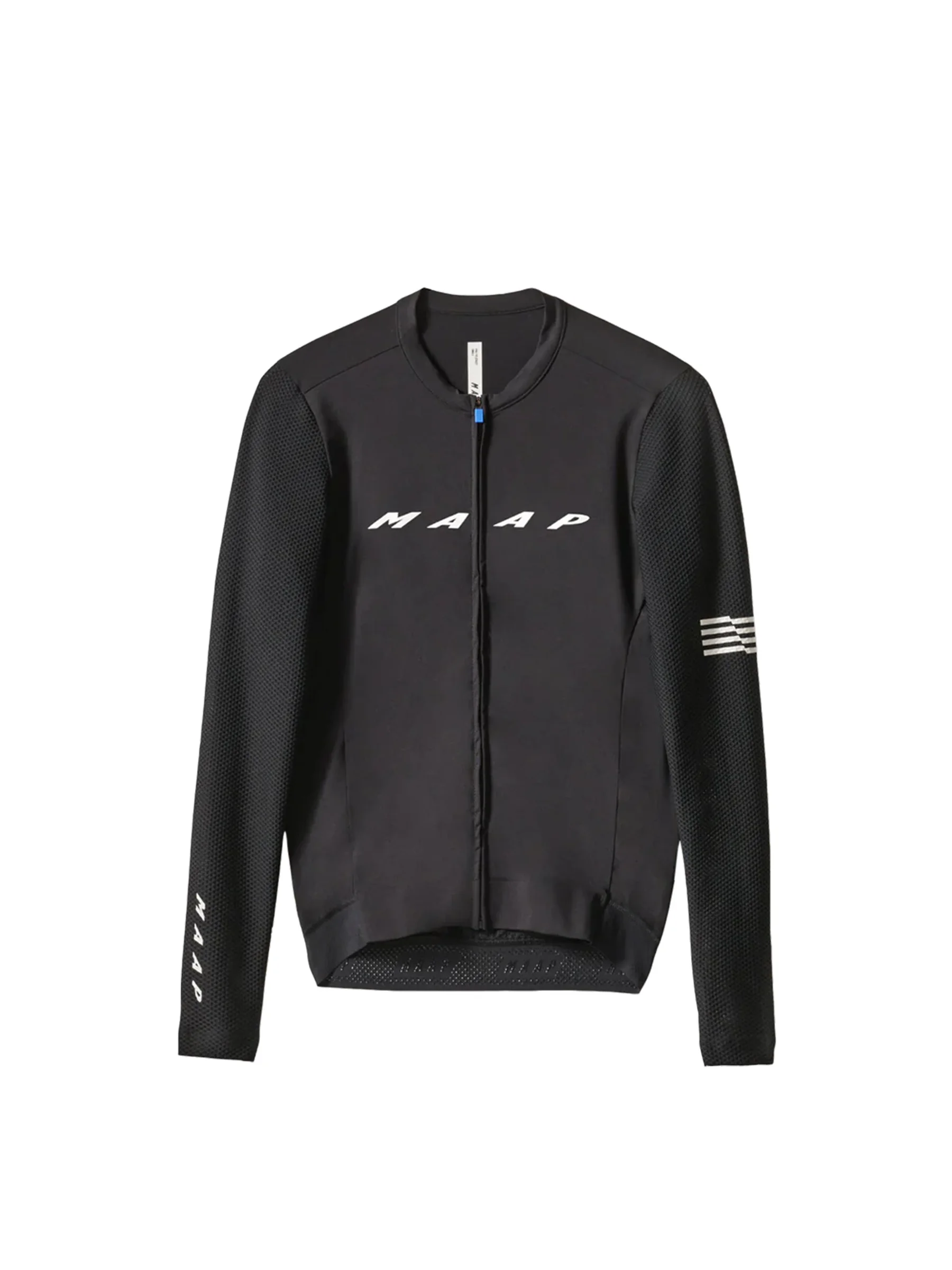Our best-selling long-sleeve jersey keeps getting better. The Evade Pro Base Long Sleeve Jersey 2.0 has been re-imagined with a range of sustainable materials and fresh design details for a jersey that fits so well you'll forget you're wearing it. Ultra-soft fabrics paired with advanced moisture-wicking technology keep you cool and dry even when the pace is on. Details - Recycled Yarns - MAAP Honeycomb - Moisture Wicking - bluesign® APPROVED Fabric - Breathable Features - The signature Race Fit features a low profile collar, advanced sleeve fit and tailored panelling for a high-performance silhouette - Recycled dyed honeycomb mesh sleeves provide advanced breathability - A bonded front-hem and rear pocket edge construction reduces bulk for an elevated fit - The back side zip stash pocket keeps your cash, keys and other valuables secure - Reflective print transfers and tabs for extra visibility in low light conditions Specifications - Product Weight: 175 g - 6.17 oz - Main Fabric Content: MAIN BODY: 70% POLYAMIDE (RECYCLED), 30% ELASTANE, SLEEVES: 78% POLYAMIDE (RECYCLED), 22% ELASTANE - Fit: Race - Temperature Range: 18-35 DEGREES - Riding Conditions: Hot - SKU: MAP-MAL167_BLK