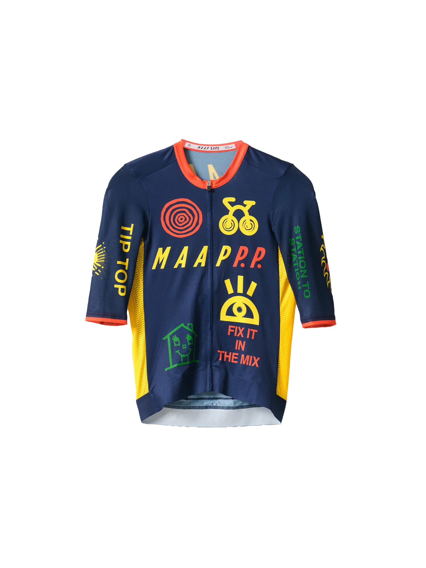 Ride in rhythm with the MAAP + Public Possession Pro Air Jersey 3.0. Precision-designed for peak breathability, featuring targeted open mesh zones that enhance airflow during high-intensity efforts. Details - Moisture Wicking - Lightweight - Breathable - Recycled Yarns - Italian Fabric Features - Optimal airflow in warmer conditions with micro-perforated fabrics engineered with majority recycled yarns. - Integrated seamless front hem with back hem gripper for added stability. - Sleek back pocket system with minimal bulk. - New added stash zip pocket for keeping small essentials secure. Specifications - Product Weight: 150g - Main Fabric Content: Main: 89% Recycled Polyester 11% Elastane, Sleeves: 96% Recycled Polyester, 4% Elastane, Side Panel: 94% Recycled Polyester, 6% Elastane - Fit: Race - Temperature Range: 22 - 40 DEGREES - Riding Conditions: Hot - SKU: MPMJE255225_NAVY