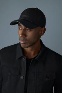 ANDERSON-NV is classic baseball cap constructed from cotton canvas with a premium leather brim. A logo patch defines the front panel while the multistitch curved visor adds timeless detail. An elevated accessory for the nomadic city explorer. DETAILS - Classic baseball cap silhouette - Cotton canvas - Leather brim - Contrast "MACKAGE" logo - Embroidered eyelets for ventilation - Adjustable snap-back closure COMPOSITION & CARE - Shell: 100% cotton. Combo shell 1: 100% lamb leather.