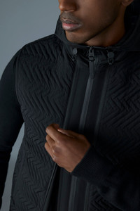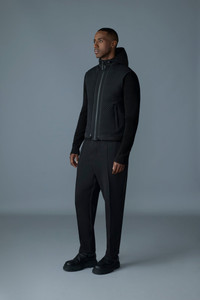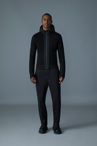 BARRETT-Z is a hybrid light jacket designed with a 3-in-1 functionality for superior weather adaptability. The outer layer, a chevron quilted vest, is insulated with GRS-certified recycled down, ensuring warmth in various conditions. This layer features welt pockets and a center front zipper closure. The vest can be worn alone for a sharp, minimalist look.The second layer consists of a cozy sweater that provides additional insulation and comfort. It includes a contrasting nylon hood that adds modern detailing and also zips into the outer vest for a seamless transition between styles. The "MACKAGE" silicone logo on the hem of the vest adds a signature finish to both configurations.Together or separately, the pieces offer modular functionality to suit changing climates and style preferences. DETAILS - 3-in-1 quilted hybrid light jacket - GRS certified recycled down for insulation - Sweater knit body (inner layer) - Center front zipper closure for each layer - Welt pockets on the outer layer - Zipper to connect layers for versatility - Hood in contrasting fabric (inner layer) - "MACKAGE" silicone logo on hem - Temperature coverage: down to 5ºC SIZE & FIT - REGULAR – Classic fit allowing comfort and style. - Designed to be worn with heavier layers. - The model is 6'2" (187 cm) and wears a size 40. - Coat length from shoulder to hem: 25'' / 64 cm. COMPOSITION & CARE - Shell: 42% wool, 42% acrylic, 14% polyester, 2% elastane/spandex. Combo shell 1: 82% recycled nylon, 18% elastane/spandex. Combo shell 2: 100% recycled polyester. Lining: 100% recycled nylon. Filling: 90% GRS-certified down, 10% feathers. - Dry clean by a leather specialist using only oil-based solvent. Do not use perchloroethylene.