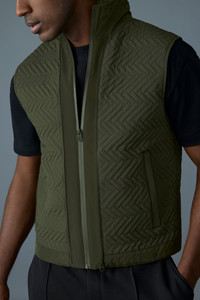 BARRETT is a hybrid light jacket designed with a 3-in-1 functionality for superior weather adaptability. The outer layer, a chevron quilted vest, is insulated with GRS-certified recycled down, ensuring warmth in various conditions. This layer features welt pockets and a center front zipper closure. The vest can be worn alone for a sharp, minimalist look.The second layer consists of a cozy sweater that provides additional insulation and comfort. It includes a contrasting nylon hood that adds modern detailing and also zips into the outer vest for a seamless transition between styles. The "MACKAGE" silicone logo on the hem of the vest adds a signature finish to both configurations.Together or separately, the pieces offer modular functionality to suit changing climates and style preferences. DETAILS - 3-in-1 quilted hybrid light jacket - GRS certified recycled down for insulation - Sweater knit body (inner layer) - Center front zipper closure for each layer - Welt pockets on the outer layer - Zipper to connect layers for versatility - Hood in contrasting fabric (inner layer) - "MACKAGE" silicone logo on hem - Temperature coverage: down to 5ºC SIZE & FIT - REGULAR – Classic fit allowing comfort and style. - Designed to be worn with heavier layers. - The model is 6'2" (187 cm) and wears a size 40. - Coat length from shoulder to hem: 25'' / 64 cm. COMPOSITION & CARE - Shell: 42% wool, 42% acrylic, 14% polyester, 2% elastane/spandex. Combo shell 1: 82% recycled nylon, 18% elastane/spandex. Combo shell 2: 100% recycled polyester. Lining: 100% recycled nylon. Filling: 90% GRS-certified down, 10% feathers. - Dry clean by a leather specialist using only oil-based solvent. Do not use perchloroethylene.