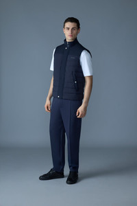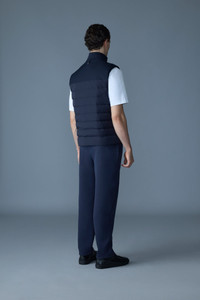 BRODY is an updated lighter version of a classic down vest, crafted with lightweight stretch nylon and a durable twill material at front and back yoke. Designed for warmth without bulk, this vest features a rib knit collar for added comfort and a quilted body that enhances its sleek silhouette. Snap-secured welt pockets and MACKAGE silicone branding on the chest add extra flair. Perfect for layering in transitional weather. DETAILS - Down-filled quilted vest - Twill material with lightweight stretch down - Center front zipper closure with placket and snaps - Rib knit collar - Welt pocket with snap closure - Inside pocket - MACKAGE silicone branding on chest SIZE & FIT - REGULAR – Classic fit allowing comfort and style. - Designed to be worn with heavier layers. - The model is 6'2" (187 cm) and wears a size 40. - Coat length from shoulder to hem: 26'' / 66 cm. COMPOSITION & CARE - Shell: 82% recycled nylon, 18% elastane/spandex. Lining: 100% recycled nylon. Filling: 90% GRS-certified down, 10% feathers. Water repellant & water resistant. - Dry clean by a leather specialist using only oil-based solvent. Do not use perchloroethylene.
