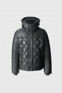 CASH is a down-filled leather jacket featuring diamond quilting at body and a 2-in-1 bib with hood lined in plush shearling. Designed for harsh winter conditions, it offers insulated protection through a center front zip closure with snap placket, rib knit cuffs, and double-entry waist pockets. The regular-fit silhouette and modular functionality provide a luxurious take on winter layering. DETAILS - Down-filled jacket - Temperature Rating: -20°C - Diamond-quilted lambskin leather shell - 2-in-1 removable bib with hood - Hood lined in shearling - Water-repellent - Center front zip closure with snap placket - Double-entry insulated waist pockets with zip and flap - Inner welt pocket with zipper - Rib knit cuffs and adjustable bungee at hem - Fully lined - Signature metal “M” logo at sleeve SIZE & FIT - REGULAR – Classic fit allowing comfort and style. - Designed to be worn with heavier layers. - The model is 6'2" (187 cm) and wears a size 40. - Coat length from shoulder to hem: 26.75'' / 53 cm. COMPOSITION & CARE - Shell: 100% sheep leather. Lining: 100% recycled nylon. Filling: 90% down, 10% feathers. water-repellent, . - Dry clean by leather specialist using oil based solvent only. Do not use perchloroethylene.