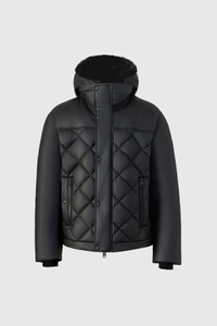 CASH is a down-filled leather jacket featuring diamond quilting at body and a 2-in-1 bib with hood lined in plush shearling. Designed for harsh winter conditions, it offers insulated protection through a center front zip closure with snap placket, rib knit cuffs, and double-entry waist pockets. The regular-fit silhouette and modular functionality provide a luxurious take on winter layering. DETAILS - Down-filled jacket - Temperature Rating: -20°C - Diamond-quilted lambskin leather shell - 2-in-1 removable bib with hood - Hood lined in shearling - Water-repellent - Center front zip closure with snap placket - Double-entry insulated waist pockets with zip and flap - Inner welt pocket with zipper - Rib knit cuffs and adjustable bungee at hem - Fully lined - Signature metal “M” logo at sleeve SIZE & FIT - REGULAR – Classic fit allowing comfort and style. - Designed to be worn with heavier layers. - The model is 6'2" (187 cm) and wears a size 40. - Coat length from shoulder to hem: 26.75'' / 53 cm. COMPOSITION & CARE - Shell: 100% sheep leather. Lining: 100% recycled nylon. Filling: 90% down, 10% feathers. water-repellent, . - Dry clean by leather specialist using oil based solvent only. Do not use perchloroethylene.