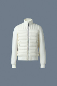 COLLIN-R is an transitional jacket for men with a classic bomber style. Expertly tailored to slim fit, it features a recycled lustrous nano down front contrasted with soft double face jersey sleeves and back. The rib knit stand collar and trims add tactical detailing and warmth. A modern multi-season layer with effortless style. DETAILS - Mixed media transitional jacket - Bomber style - Recycled lustrous light nano down front - Double-face jersey sleeves and back - Centre front zip closure - Rib knit stand collar - hem and cuffs - Zip waist pockets - Signature M logo patch on left sleeve - Machine washable - Slim fit SIZE & FIT - SLIM – Our signature fit, closest to the body. - Designed to be worn with light layers, all while keeping you warm. - For heavier layering, we recommend sizing up. - The model is 6'2" (187 cm) and wears a size L. - Length from shoulder to hem: 26 ½'' / 67 cm. COMPOSITION & CARE - Shell: 53% cotton, 47% polyester. Combo Shell 1: 100% recycled nylon. Lining: 100% recycled nylon. Filling: 90% GRS-certifed duck down, 10% feathers. Water-repellent & water-resistant. - Close zippers. Remove fur. Remove the puller. Wash inside out. Wash in domestic machine in water not exceeding 40°C, at normal setting. Use mild detergent. Remove immediately after washing. Do not soak. Tumble dry low heat with tennis balls, until fully dried (1to 3 hours). Do not wet-clean. Do not bleach. Do not wring. Do not iron or press. Dry clean using oil based solvent only. Do not use perchloroethylene.