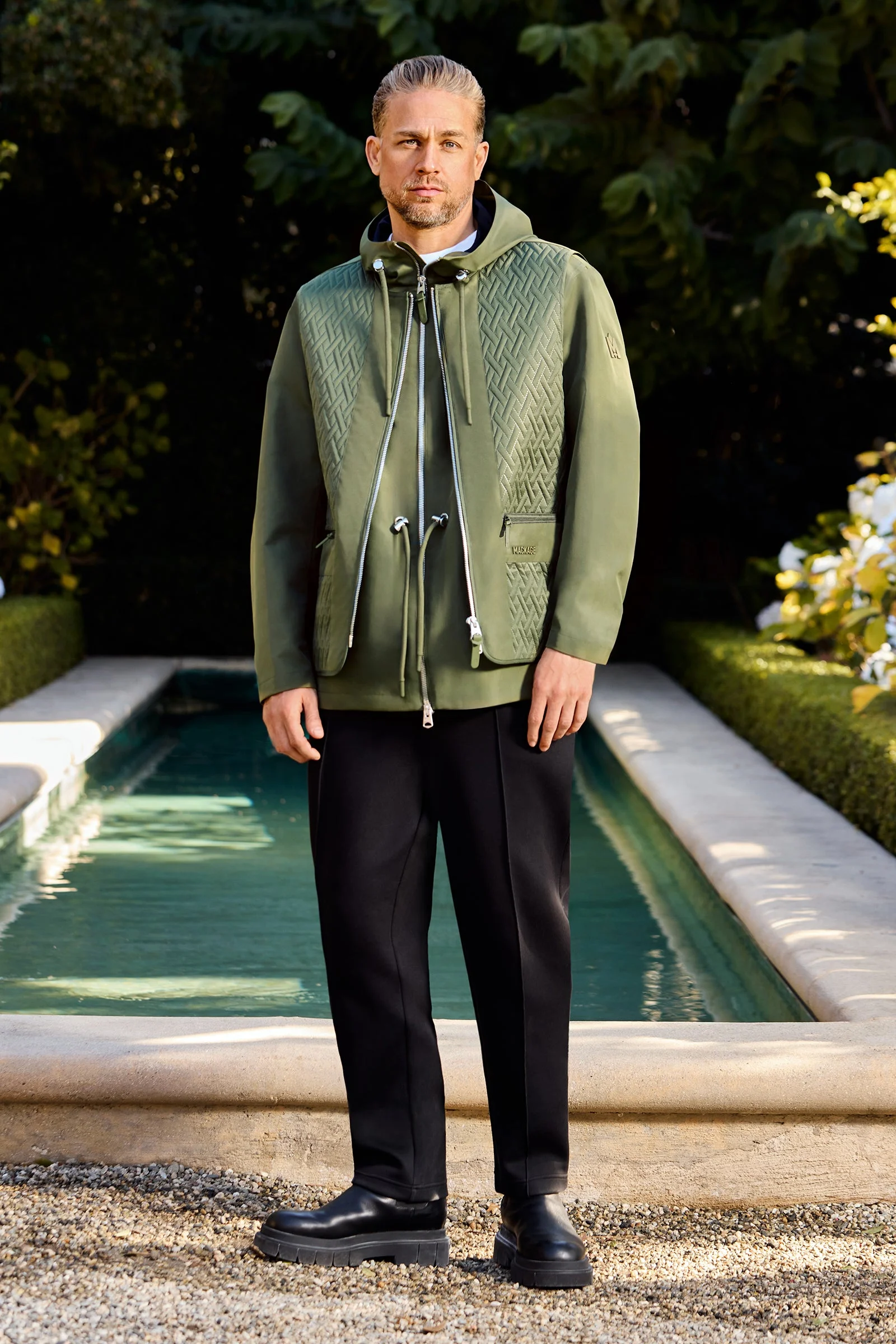 DIEGO is a versatile 3-in-1 rain jacket featuring a hooded inner layer and a quilted outer vest, designed for layering and versatile wear. The outer layer showcases a contrast yoke and criss-cross quilting, while the inner jacket includes an adjustable drawcord at the waist and embroidered eyelets for ventilation. Vest can be worn as a warm accessory layer and the jacket can be worn as a light shell. MACKAGE branding and tonal silicone patches add signature touches to this modular piece. DETAILS - 3-in-1 jacket with quilted outer layer - Hooded inner jacket - Center front zipper closures on both layers - Adjustable drawcord at waist (inner layer) - Adjustable sleeves at hem (inner layer) - Contrast yoke and detailed paneling on outer layer - MACKAGE silicone branding and “M” tonal silicone patch - Embroidered eyelets for ventilation - Unlined SIZE & FIT - RELAXED – Loose fit for on the go comfort. - Designed to be worn with heavier layers. - The model is 6'2" (187 cm) and wears a size 40. - Coat length from shoulder to hem: 30 ¼'' / 77 cm. COMPOSITION & CARE - Shell: 100% polyester. Combo shell 1: 100% recycled polyester. Filling: 100% polyester. - Dry clean by a leather specialist using only oil-based solvent. Do not use perchloroethylene.