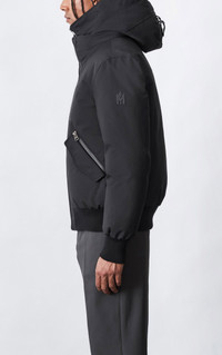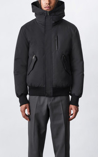 DIXON-NFR is a Nordic Tech sustainable down bomber with a removable hooded bib and zigzag stitch storm visor. Designed for maximum comfort in deep winter, it is windproof, water resistant, repellent, and breathable. Insulated pockets, a 2-layer weave, and rib hems add warmth while hidden zip back vents bring multi-function. A street-style cut with tactical performance made for any outdoor adventure. DETAILS - Bomber jacket - Sustainable down - Nordic Tech weave for ultimate warmth - Removable hooded bib - Storm visor with zigzag stitch - Center front zip with storm placket - Insulated dual-entry waist pockets with zip flap - Leather welt Napoleon zip pocket - Back body hidden zip vents - Rib hem and storm cuffs - Leather snap tape - M logo patch on left sleeve - Regular fit for comfort and style SIZE & FIT - REGULAR – Classic fit allowing comfort and style. - Designed to be worn with heavier layers. - Model is 6' 1/2" / 186 cm and wears a size XS - Coat length from shoulder to hem: 27 1/2" / 69.8 cm COMPOSITION & CARE - Shell (Woven): 59% Polyamide/ Nylon, 41% Polyester. Combo: 100% Cow Leather. Lining: 100% Polyamide/ Nylon. Filling: 90% Duck Down, 10% Feathers. Water-resistant & water-repellent. - Dry clean by leather specialist using oil based solvent only.Do not use perchloroethylene.