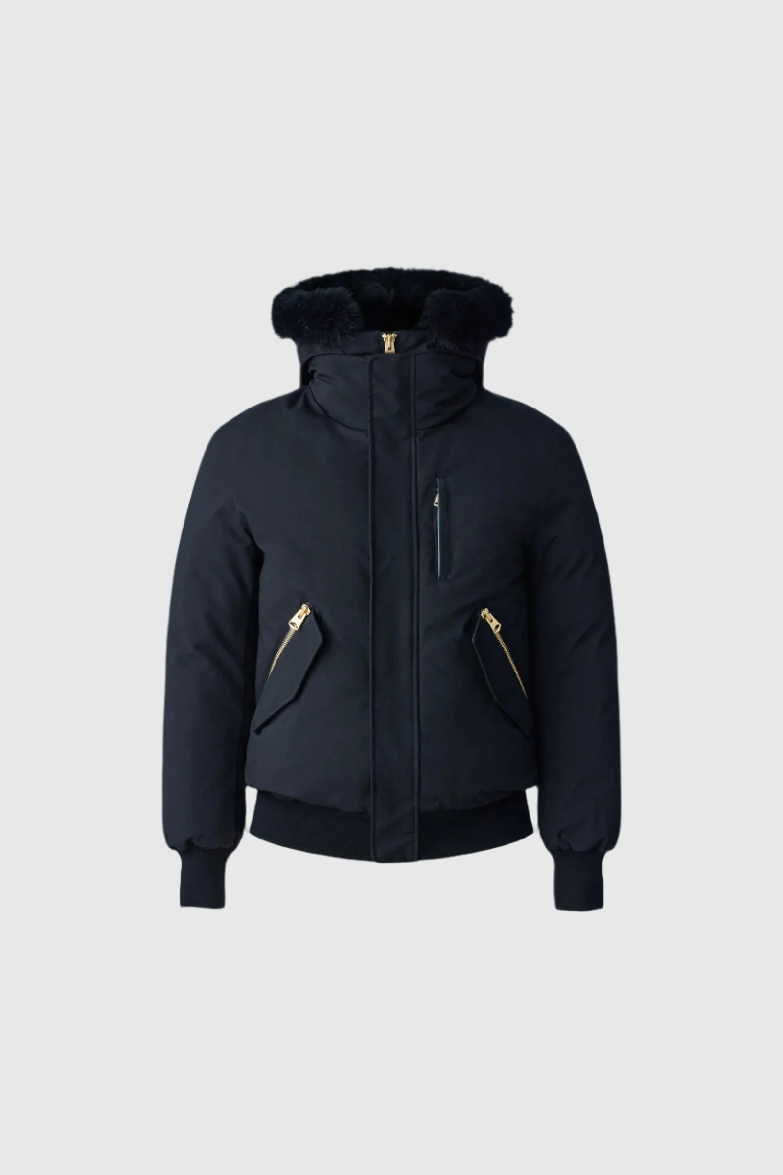 DIXON-BX is a recycled down bomber jacket for men made with our proprietary bonded Nordic Tech shell. An iconic style with classic lines, it boasts a removable lustrous down hooded bib with a detachable sustainable blue fox fur trim. Expertly designed for warmth in subzero temperatures, the insulated pockets, rib knit trims, and hidden zip back vents ensure maximum comfort. DETAILS - Down bomber jacket - 100% recycled down - 2-layer Nordic Tech shell with TPU membrane - Removable bib with sustainable fur-lined hood - Detachable sustainable blue fox fur trim - Centre front zip closure - Storm placket with hidden snaps and (R) Leather tape - Insulated dual-entry waist pockets with zip flap - Napoleon zip pocket with (R) Leather welt - Hidden zip vents at back - Rib knit cuffs and hem - Leather snap tape - Signature M logo on left sleeve - Classic fit SIZE & FIT - REGULAR – Classic fit allowing comfort and style. - Designed to be worn with heavier layers. - Coat length from shoulder to hem: 30'' / 76.2 cm. COMPOSITION & CARE - Shell : 59% polyamide/nylon, 41% polyester. Lining: 100% polyamide/nylon. Filling: 90% duck down, 10% feathers. Fur: 100% finland blue fox. Fur 2: 100% rabbit. Water-repellent & water-resistant. - Dry clean by leather specialist using oil based solvent only. Do not use perchloroethylene.