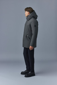 EDWARD is a 2-in-1 Nordic Tech down coat for men with a removable hooded bib and a windproof shell cut from our breathable and air permeable 2-layer fabric. Engineered for maximum warmth in the most extreme temperatures, it boasts storm cuffs and insulated pockets. Cinch the drawcord for extra protection. An uncompromising performance-ready piece with utilitarian detail. - Mid-length down jacket - 800 fill power - Traceable duck down - Arctic Rated: Down to -25°C - Removable bib with hood - 2-layer fabric with membrane - Draw-cord for heat retention - Water resistant and repellent - Insulated pockets - Storm cuffs - Double waist zip pockets and flap with hidden snap - Chest pockets with hidden snap closure - Regular fit SIZE & FIT - REGULAR – Classic fit allowing comfort and style. - Designed to be worn with heavier layers. - Coat length from shoulder to hem: 33.5'' / 85 cm. COMPOSITION & CARE INSTRUCTIONS - Shell : 59% polyamide/nylon, 41% polyester. Combo 100% cow leather. Lining: 100% polyamide/nylon. Filling: 90% duck down, 10% feathers. Water-repellent & water-resistant. - Dry clean by leather specialist using oil based solvent only. Do not use perchloroethylene.