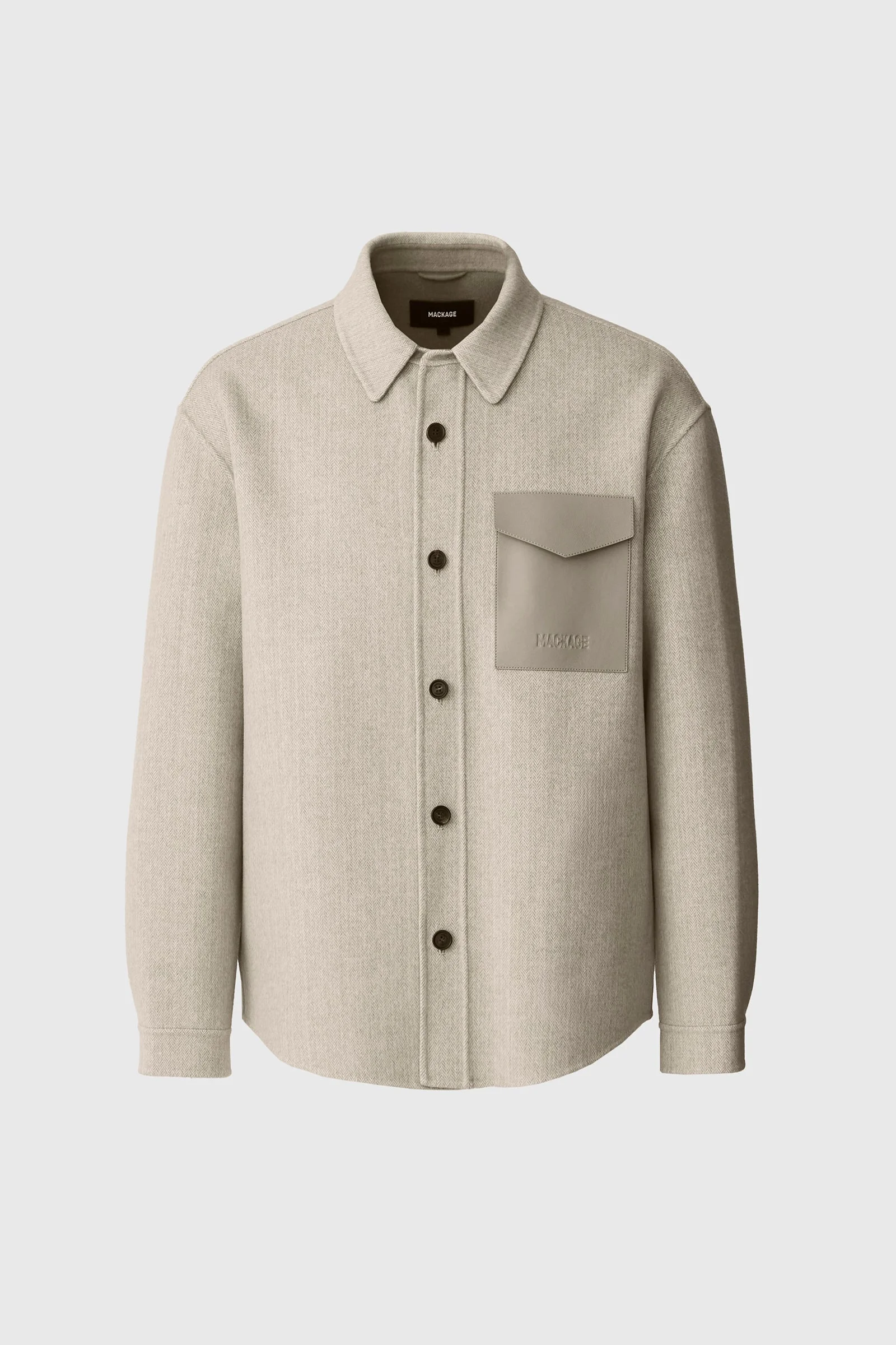EMMANUEL-HB is a luxurious wool overshirt featuring a refined Herringbone pattern. Double-face construction with a solid colour interior, it convertible collar and front button closure allow for adaptable styling while horn buttons and leather patch pocket with logo add elevated detailing throughout. A ready-to-wear staple with luxe detailing. DETAILS - Double-face wool overshirt - Herringbone pattern at exterior - Solid colour at interior - Responsible Wool Standard (RWS) certified - Convertible collar - Debossed MACKAGE at leather patch pocket - side entry waist pocket - Button front closure - Adjustable sleeve cuffs with buttons - Relaxed fit SIZE & FIT - RELAXED – Loose fit for on the go comfort. - Designed to be worn with heavier layers. - The model is 6'2" (187 cm) and wears a size 40. - Coat length from shoulder to hem: 31.25'' / 80 cm. COMPOSITION & CARE - Shell: 100% wool. - Dry clean by leather specialist using oil based solvent only. Do not use perchloroethylene