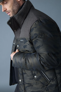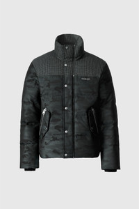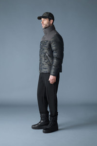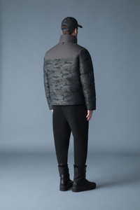 EVERETT-JC is a down-filled jacket crafted in a technical shell featuring a jacquard camouflage pattern and mini houndstooth contrast yoke and collar. Crafted with certified recycled materials, it features double-entry pockets with flaps and exposed snaps. Storm cuffs and an adjustable bungee hem seal in warmth, while rivet detailing adds a rugged touch. A practical cold-weather staple designed for durability and comfort. DETAILS - Jacquard camouflage down-filled jacket - Mini houndstooth contrast yoke and collar - Double-stitch channel quilting - GRS-certified recycled down fill - Temperature Rating: -15°C - Center front zip closure with placket and snaps - Double-entry waist pockets with flap and snap - Inside pocket - Storm cuffs - Adjustable bungee at hem - Rivet detailing - Quilted body - MACKAGE metal branding at chest - Water-resistant and windproof - Relaxed fit SIZE & FIT - REGULAR – Classic fit allowing comfort and style. - Designed to be worn with heavier layers. - The model is 6'2" (187 cm) and wears a size 40. - Coat length from shoulder to hem: 27.25'' / 133 cm. COMPOSITION & CARE - Shell: 100% polyester.Lining: 100% recycled nylon. Filling: 90% recycled down, 10% recycled feathers. Water-repellent, water-resistant. - Dry clean by leather specialist using oil based solvent only. Do not use perchloroethylene.