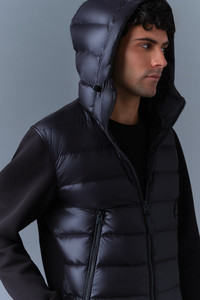 FRANK-R is a mixed-media jacket with an adjustable storm visor hood. The regular-fit bomber silhouette is defined by a recycled lustrous light-down channel quilt front. With indoor-outdoor versatility, the sleeves, shoulders, and back are crafted from a soft double-face jersey. A velvet embroidered signature M adds plush detail. DETAILS - Light down mixed-media jacket - 100% GRS-certified recycled light down front - Hood with adjustable drawcord storm visor - Double-face jersey sleeves, shoulders, and back - Centre front zip front closure - Zip waist pockets - Signature M velvet embroidery on left sleeve - Rib knit cuffs and hem - Partially lined - Water-resistant & repellent - Machine washable - Regular-fit SIZE & FIT - REGULAR – Classic fit allowing comfort and style. - Designed to be worn with heavier layers. - The model is 6'2" (187 cm) and wears a size L. - Length from shoulder to hem: 26 ¾'' / 68 cm. COMPOSITION & CARE - Shell: 53% cotton, 47% polyester. Combo Shell 1: 100% recycled nylon. Combo Shell 2: 72% polyamide/nylon, 27% polyester, 1% elastane/spandex. Lining: 100 recycled nylon. Filling: 90% GRS-certified duck down, 10% feathers. Water-repellent & water-resistant. - Close zippers. Remove fur. Remove the puller. Wash inside out. Wash in domestic machine in water not exceeding 40°C, at normal setting. Use mild detergent. Remove immediately after washing. Do not soak. Tumble dry low heat with tennis balls, until fully dried (1to 3 hours). Do not wet-clean. Do not bleach. Do not wring. Do not iron or press. Dry clean using oil based solvent only. Do not use perchloroethylene.