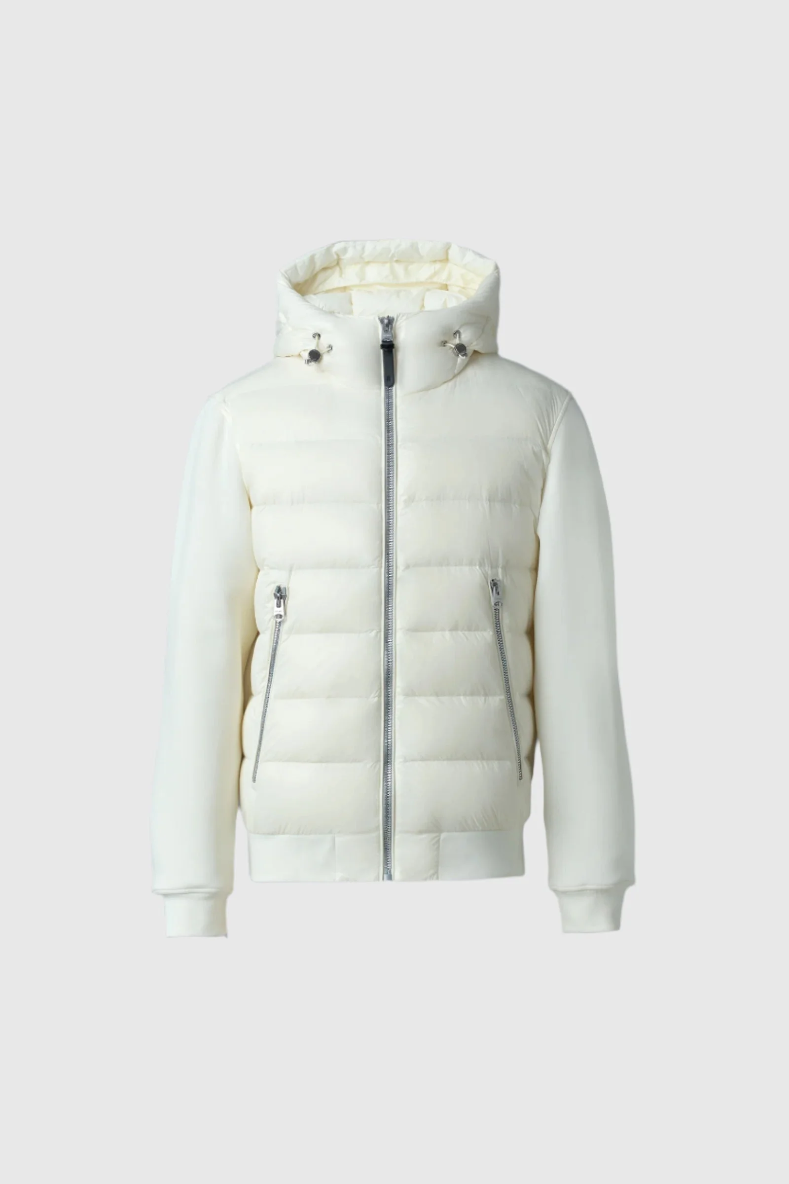 FRANK-R is a mixed-media jacket with an adjustable storm visor hood. The regular-fit bomber silhouette is defined by a recycled lustrous light-down channel quilt front. With indoor-outdoor versatility, the sleeves, shoulders, and back are crafted from a soft double-face jersey. A velvet embroidered signature M adds plush detail. DETAILS - Light down mixed-media jacket - 100% GRS-certified recycled light down front - Hood with adjustable drawcord storm visor - Double-face jersey sleeves, shoulders, and back - Centre front zip front closure - Zip waist pockets - Signature M velvet embroidery on left sleeve - Rib knit cuffs and hem - Partially lined - Water-resistant & repellent - Machine washable - Regular-fit SIZE & FIT - REGULAR – Classic fit allowing comfort and style. - Designed to be worn with heavier layers. - The model is 6'2" (187 cm) and wears a size L. - Length from shoulder to hem: 26 ¾'' / 68 cm. COMPOSITION & CARE - Shell: 53% cotton, 47% polyester. Combo Shell 1: 100% recycled nylon. Combo Shell 2: 72% polyamide/nylon, 27% polyester, 1% elastane/spandex. Lining: 100 recycled nylon. Filling: 90% GRS-certified duck down, 10% feathers. Water-repellent & water-resistant. - Close zippers. Remove fur. Remove the puller. Wash inside out. Wash in domestic machine in water not exceeding 40°C, at normal setting. Use mild detergent. Remove immediately after washing. Do not soak. Tumble dry low heat with tennis balls, until fully dried (1to 3 hours). Do not wet-clean. Do not bleach. Do not wring. Do not iron or press. Dry clean using oil based solvent only. Do not use perchloroethylene.