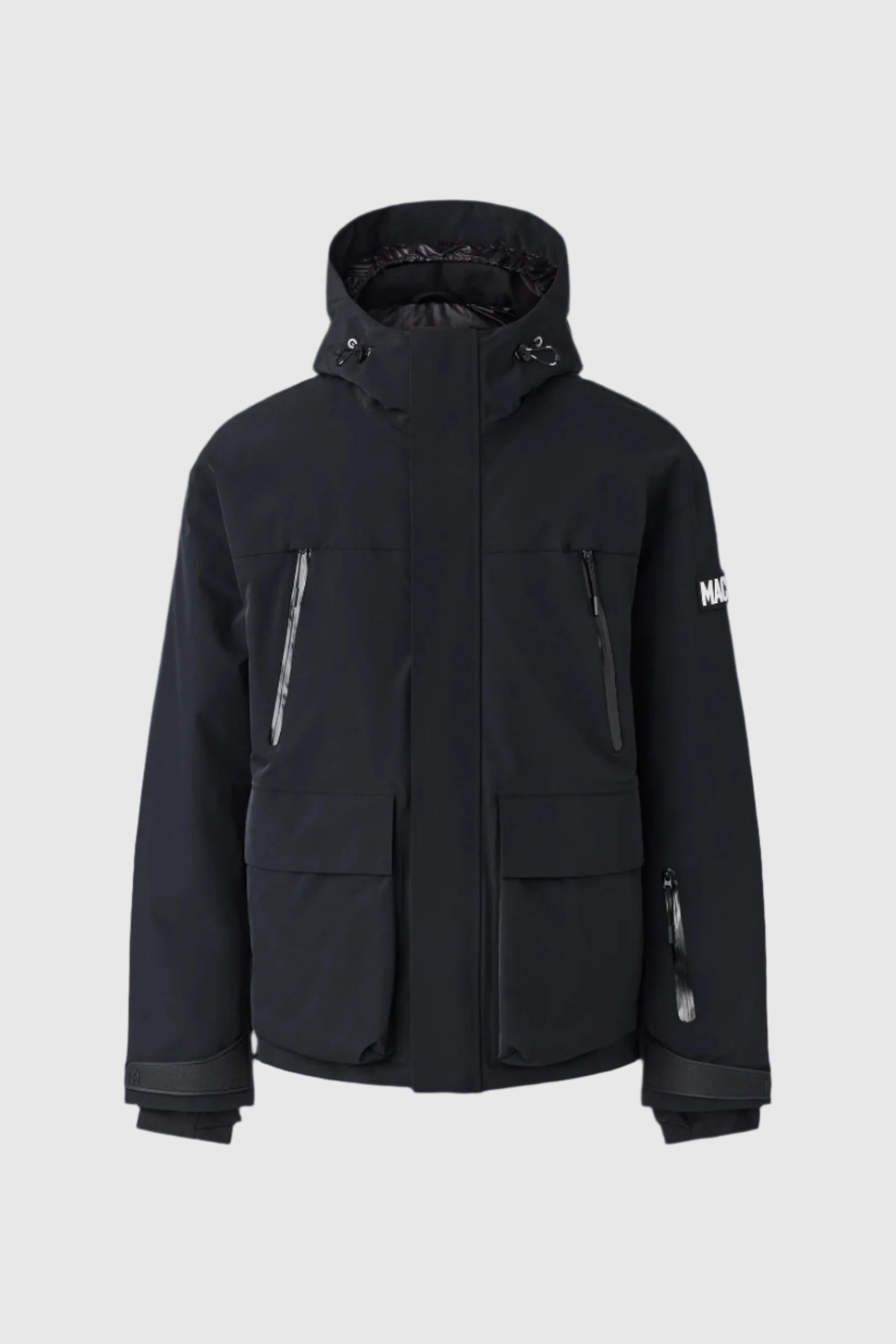 FROST is a recycled down ski jacket for men crafted from our AGILE-360 2-way stretch shell for optimal flexibility. With drop shoulders and a seam sealed construction, it features an adjustable drawcord storm visor hood and centre front zip with branded embossed storm placket. Designed for the harshest conditions, adjustable silicone Velcro cuff tabs and rib knit storm cuffs lend adaptive protection. Water resistant, repellent, and breathable, the insulated 3D dual-entry cargo pockets, zip chest pockets, and sleeve zip pocket offer utility. A performance-driven piece with forward lines. DETAILS - Recycled down ski jacket - Deep Cold: Down to -15°C - AGILE-360 2-layer shell with 2-way stretch - Seam sealed construction - Hood with adjustable drawcord storm visor - Drop shoulder cut - Centre front zip closure with branded embossed storm placket - Removable snow skirt at hem - Insulated dual-entry 3D cargo pockets with Velcro flap - Zip chest pockets - Zip pocket on left sleeve - Adjustable silicone Velcro cuff tab with lettermark - Active rib knit storm cuffs with thumb loop - Goggle cleaner and key holder - Underarm vents - Black waterproof zippers - Water resistant and repellent - Breathability rating 20,000 24hr - Signature M patch on left sleeve - Relaxed fit SIZE & FIT - RELAXED – Loose fit for on the go comfort. - Designed to be worn with heavier layers. - The model is wearing a size 40 - Coat length from shoulder to hem: 30'' / 76.2 cm. COMPOSITION & CARE - Shell : 84% polyamide/nylon, 16% elastane/spandex. Combo shell 1 : 82% polyamide/nylon, 18% elastane/spandex. Lining : 100% polyamide/nylon. Filling : 90% duck down, 10% feathers. Water-repellent & water-resistant. - Close zippers. Remove leather zipper puller. Wash inside out. Wash in domestic or commercial machine in water not exceeding 40°C, at normal setting. Use mild detergent. Remove immediately after washing. Tumble dry low heat with tennis balls, until fully dried (1 to 3 hours). Do not soak. Do not wet-clean. Do not bleach. Do not wring. Do not iron or press. Do not dry clean.