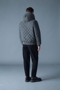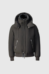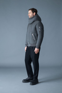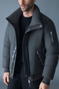 IKER-Z is a down-filled bomber with a diamond-quilted back and removable bib lined in plush shearling. It features an action back for ease of movement, adjustable hood with storm visor, and rib knit trims for a secure fit. Functional details include zip sleeve and waist pockets, and underarm eyelets for added breathability. The perfect final layer for the deep cold, or remove the bib for fairer weather. DETAILS - Down-filled bomber-style jacket - Articulated sleeves - Temperature Rating: -25°C - 2-in-1 construction with removable shearling-lined bib - Center front zip closure with placket and snaps - Double-entry waist pockets - Zippered sleeve pocket and inner welt pocket - Hood with adjustable storm visor and drawcord - Collar lined in shearling - Rib knit cuffs and hem - Action back construction - Underarm ventilation - Sleeve patch with M metal logo SIZE & FIT - REGULAR – Classic fit allowing comfort and style. - Designed to be worn with heavier layers. - The model is 6'2" (187 cm) and wears a size 40. - Coat length from shoulder to hem: 27.5'' / 50 cm. COMPOSITION & CARE - Shell: 59% polyamide/nylon, 41% polyester. Lining: 100% recycled nylon. Filling: 90% down, 10% feathers.Water-repellent, water-resistant. - Dry clean by leather specialist using oil based solvent only. Do not use perchloroethylene.