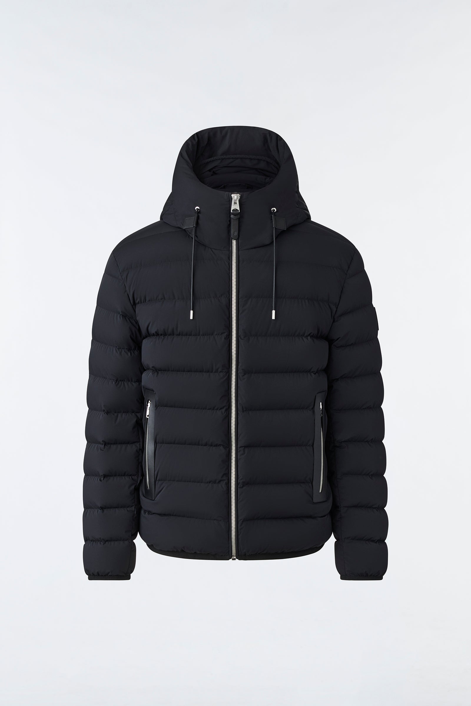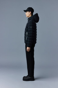 JACK is an AGILE-360 ultra light rcycled down jacket for men featuring an adjustable storm visor hood. Expertly tailored to a regular fit, the 2-way stretch shell offers ease of movement while the elastic trims and drawcord hem enhance the comfortable feel. It is water resistant and repellent, and the centre front zip is accented with edgepainted leather tape. Modern and classic, an effortless staple. - AGILE-360 ultra light down jacket - 100% recycled down - 800 fill power - Moderate Cold: Down to -15°C - 2-way stretch shell - Water resistant and repellent - Hood with adjustable drawcord storm visor - Centre front zip closure - Insulated zip waist pockets with edgepainted leather tape - embossed leather placket - Elastic hem with adjustable drawcord - Elastic cuffs - Signature M logo patch on left sleeve - Regular fit SIZE & FIT - REGULAR – Classic fit allowing comfort and style. - Designed to be worn with heavier layers. - The model is 6'2" (187 cm) and wears a size 40. - Coat length from shoulder to hem: 27'' / 68.58 cm. COMPOSITION & CARE INSTRUCTIONS - Shell: 82% polyamide/nylon, 18% elastane/spandex. Filling: 90% goose down, 10% goose feathers. - Dry clean by leather specialist using oil based solvent only. Do not use perchloroethylene.